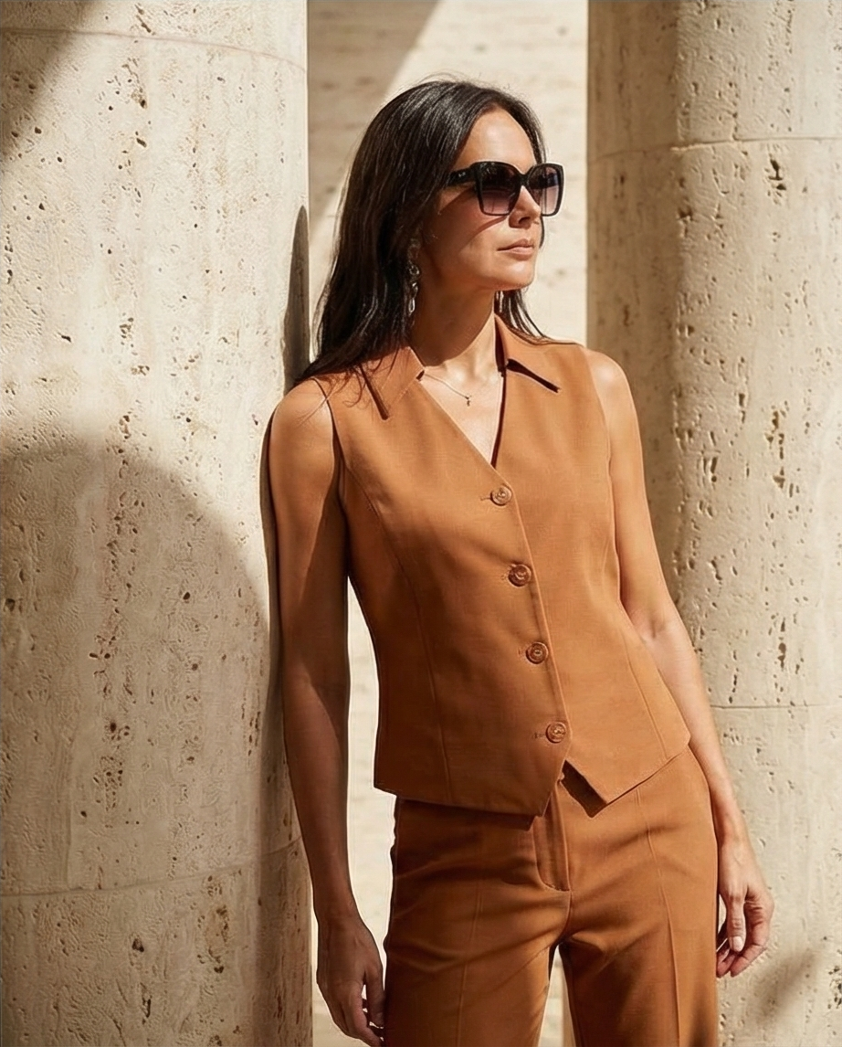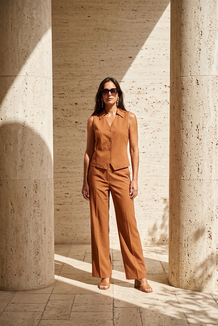 • Mulher com colete e calças castanhas largas, calçado de salto médio e óculos escuros, em ambiente com colunas de pedra.