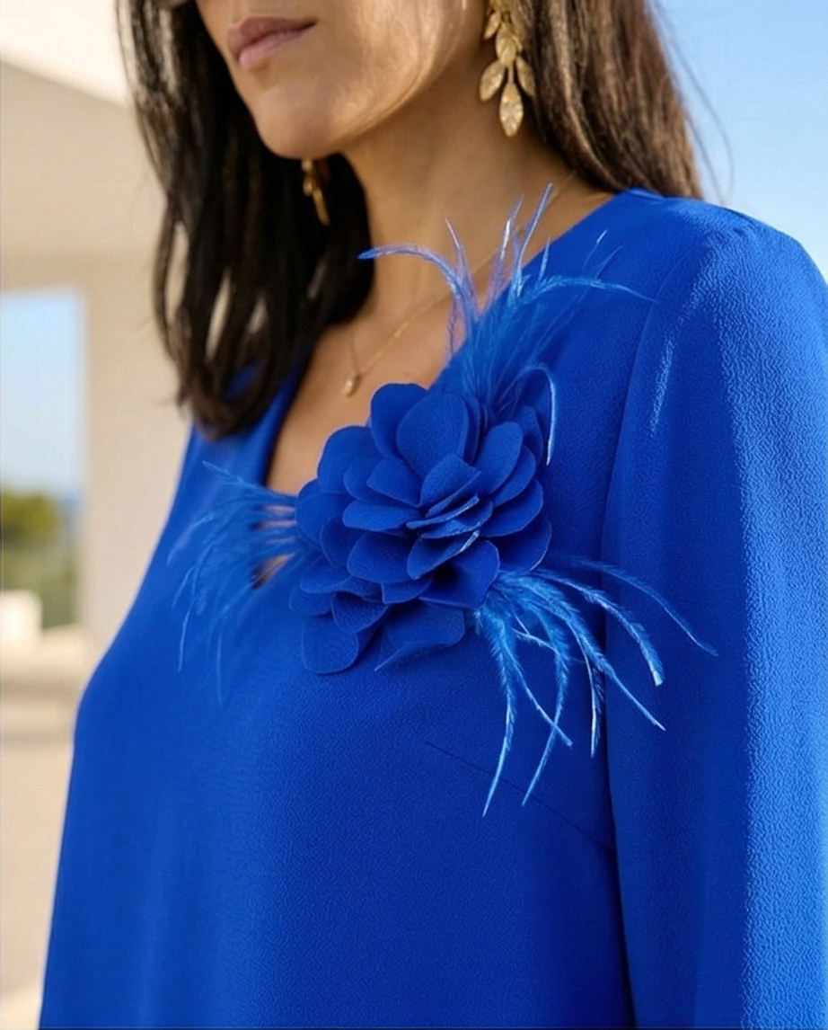 • Blusa azul com flor e penas azuis no ombro