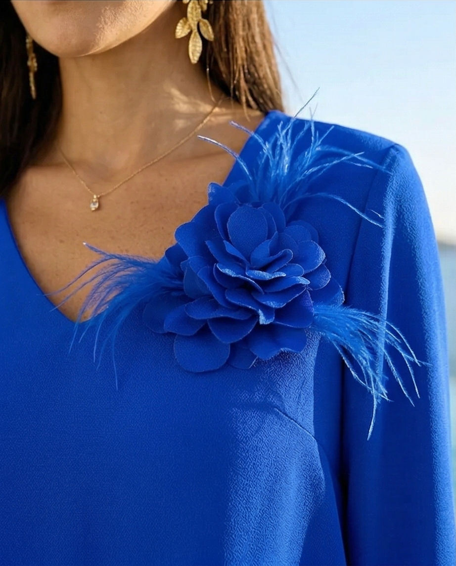 • Vestido azul royal com flor decorativa e penas no ombro