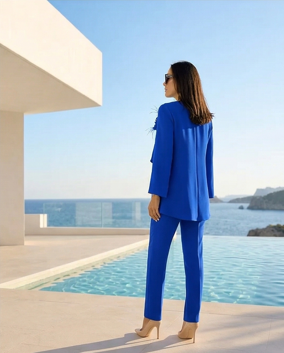 • Conjunto feminino azul com blazer longo e calças, sapatos de salto alto bege ao lado de piscina com vista para o mar