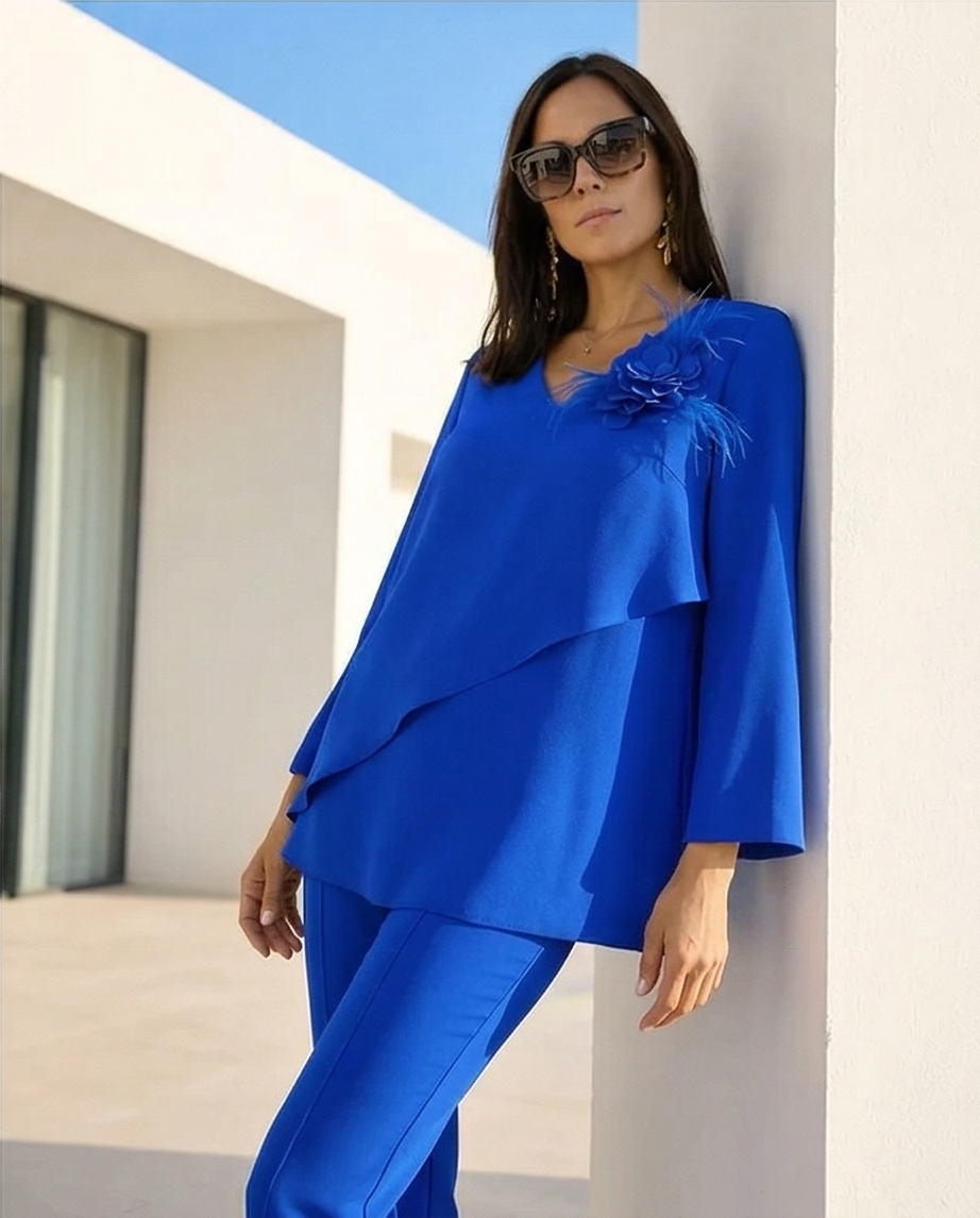 Este conjunto de 2 peças em azul é composto por uma tunica assimétrica com camadas sobrepostas, gola em V e mangas compridas. O destaque é a flor tridimensional com penas no ombro. As calças são de corte reto e fluido para um visual clássico e confortavel.