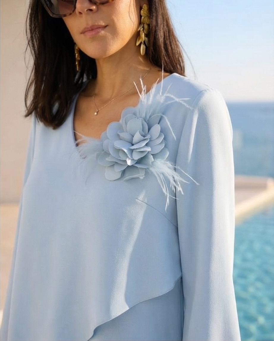 Este conjunto de 2 peças em azul  claro é composto por uma tunica assimétrica com camadas sobrepostas, gola em V e mangas compridas. O destaque é a flor tridimensional com penas no ombro. As calças são de corte reto e fluido para um visual clássico e confortavel.