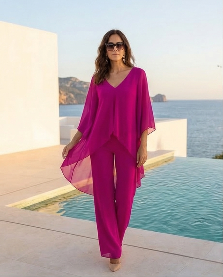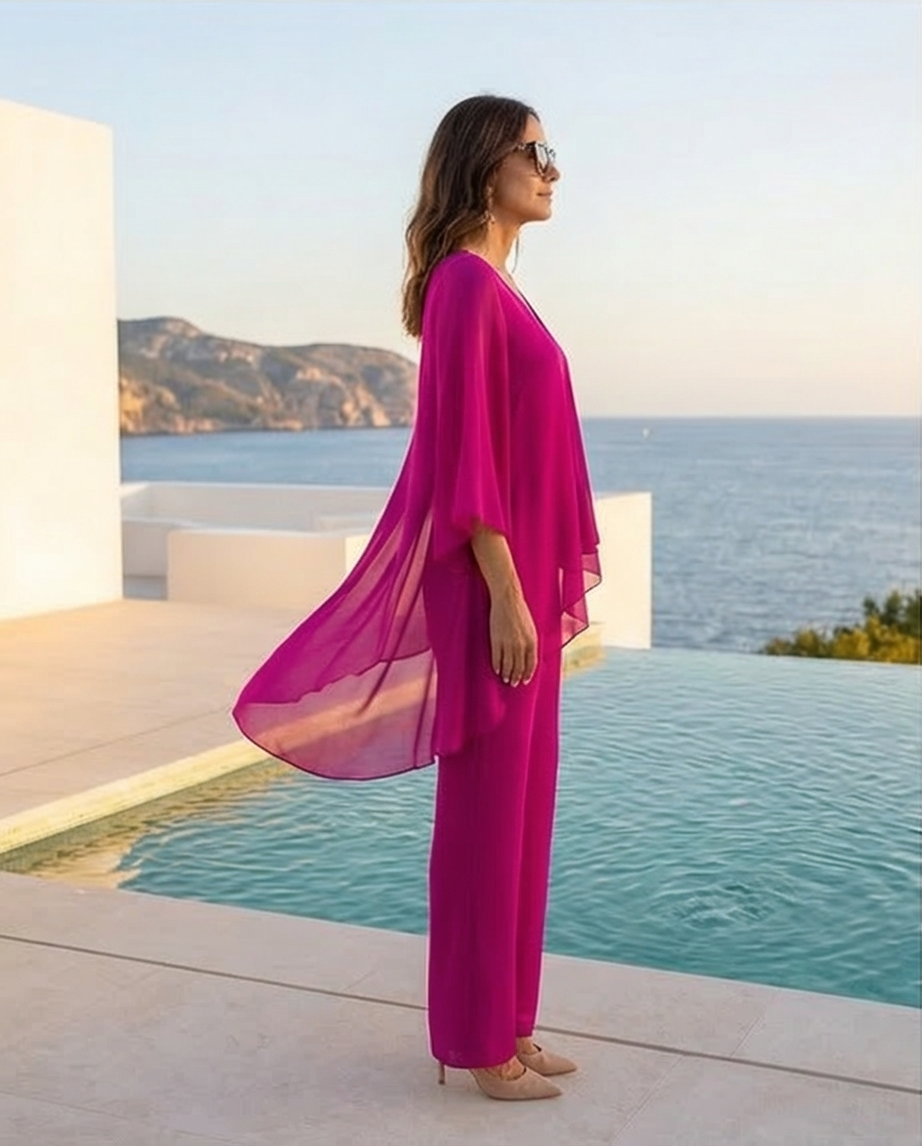 Modelo feminina veste conjunto fúcsia com blusa chiffon e calças largas junto a piscina com mar ao fundo.