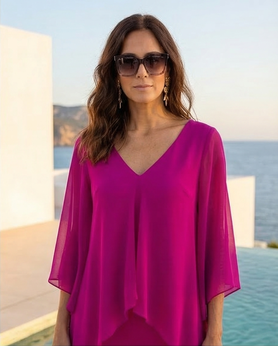 • Blusa rosa fluida de mulher com mangas 3/4 e decote em bico junto a piscina e mar