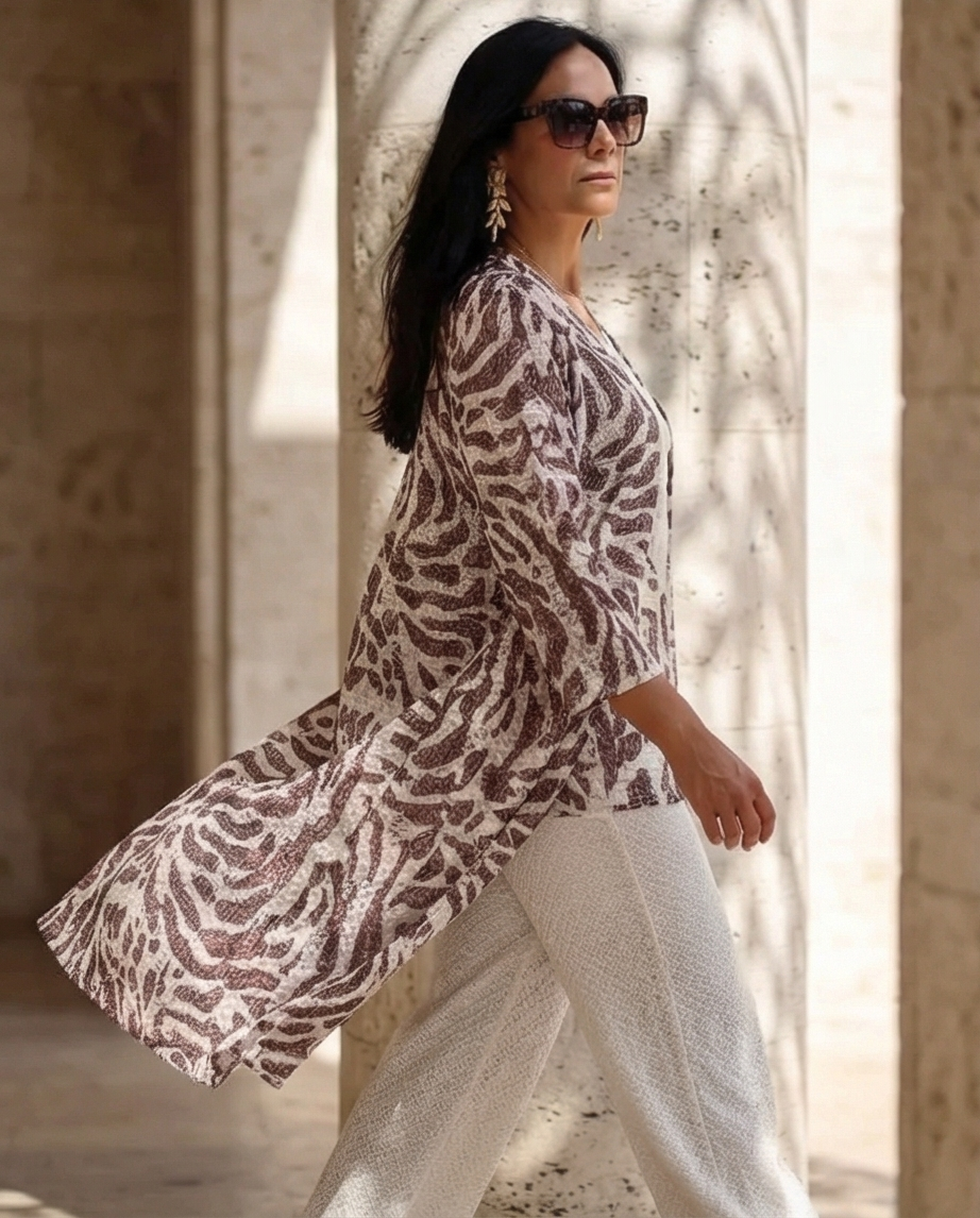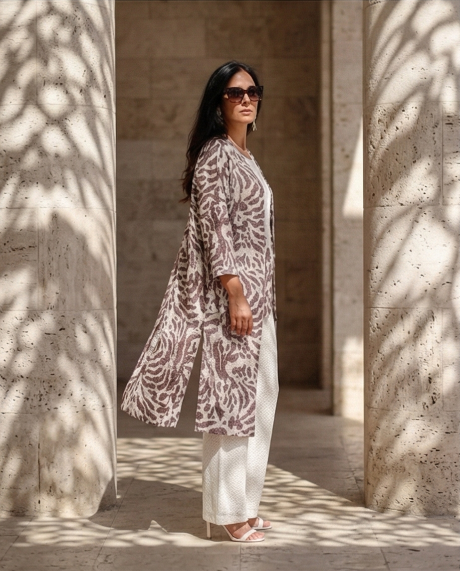 Mulher de casaco comprido estampado, conjunto branco e óculos escuros, em espaço com colunas de pedra