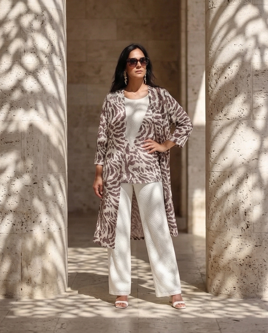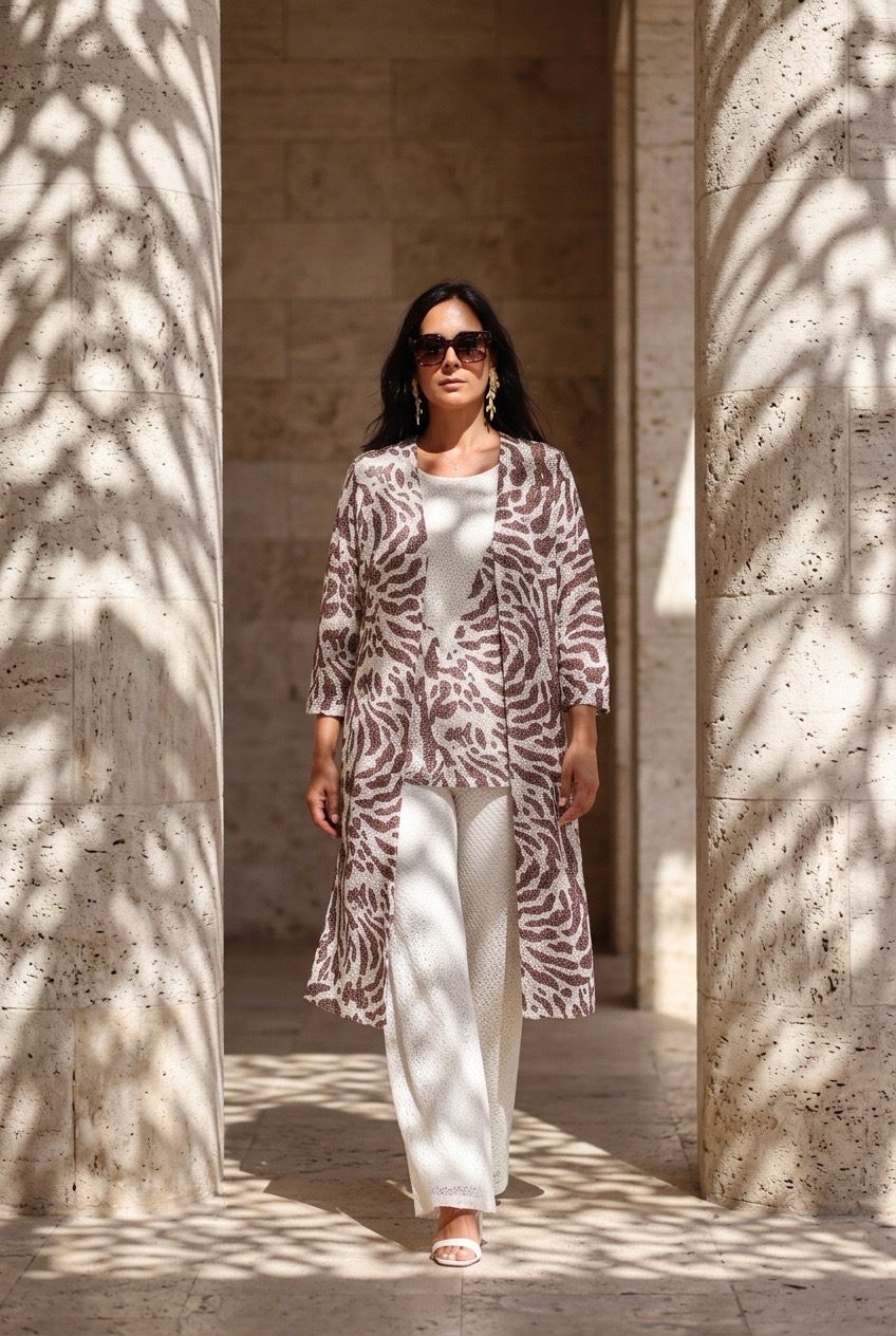 Este conjunto de 3 peças tem o padrão  tipo zebra o tecido é de renda em tons de branco e castanho, o quimono é longo, as calcças são brancas de corte fluido, a blusa é de manga curta com o desing assimétrico dum lado branco e o outro com o padrão zebra.