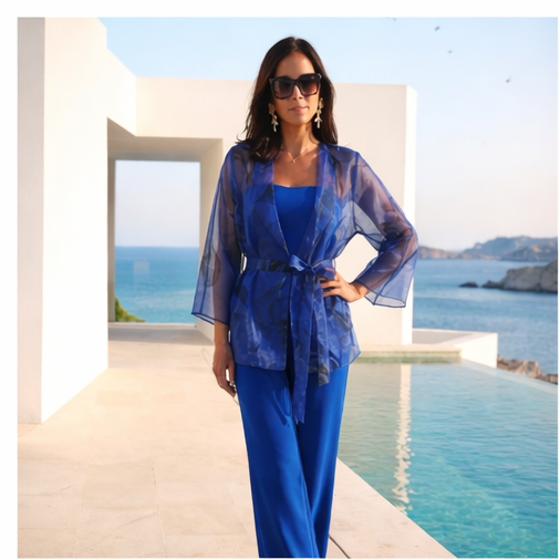 • Mulher com fato azul transparente e calças largas junto a piscina e mar