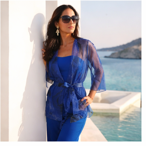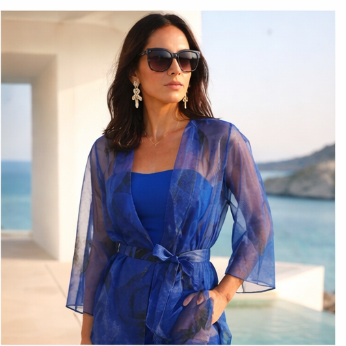 • Mulher com vestido azul transparente e faixa, usando óculos de sol e brincos, com vista para o mar