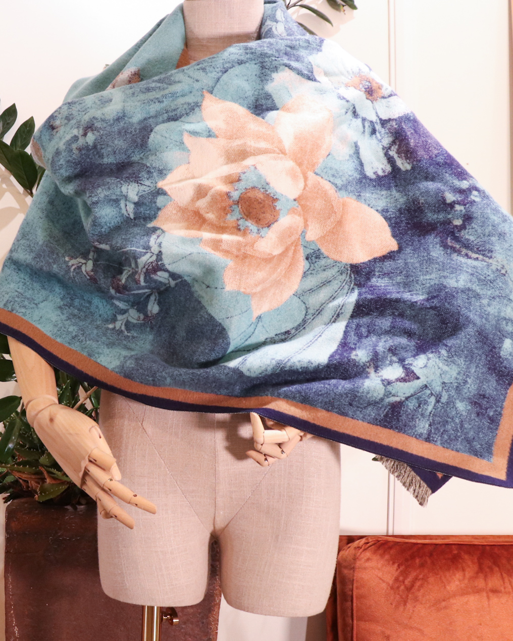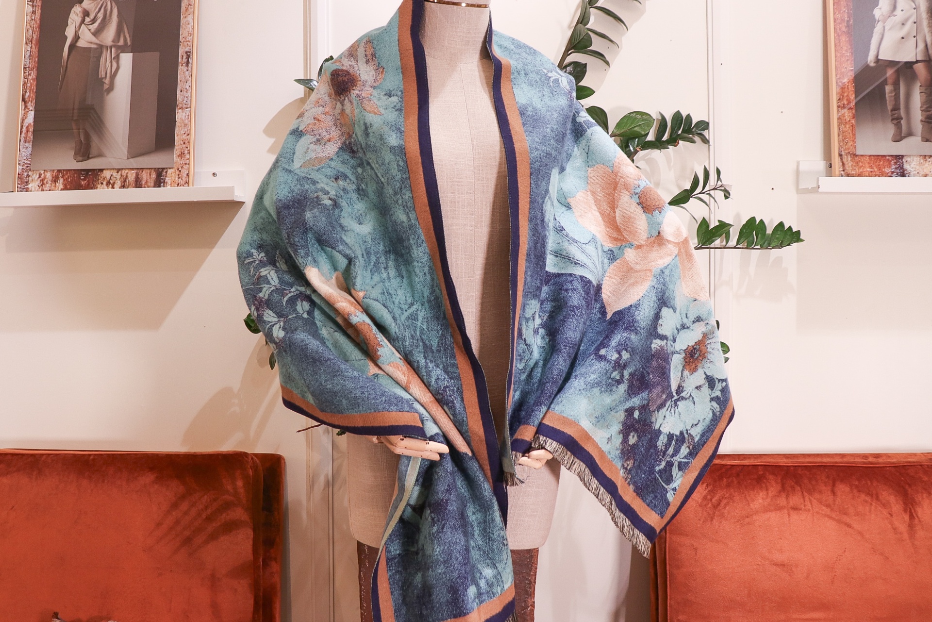 Echarpe Florença 39,40 € Desconto de %. Partilhar Comprar Contactar Echarpe macia e quente, adequada para o inverno ou para dar um toque especial e elegante ao visual. Tem uma flor prodominante em tons de azul petróleo, verde água e castanho claro, com bordas em castanho escuro e franjas sutis.