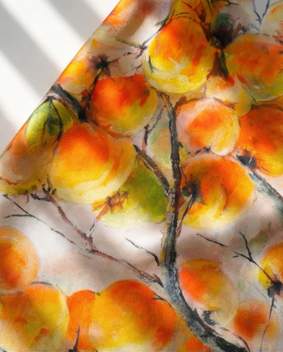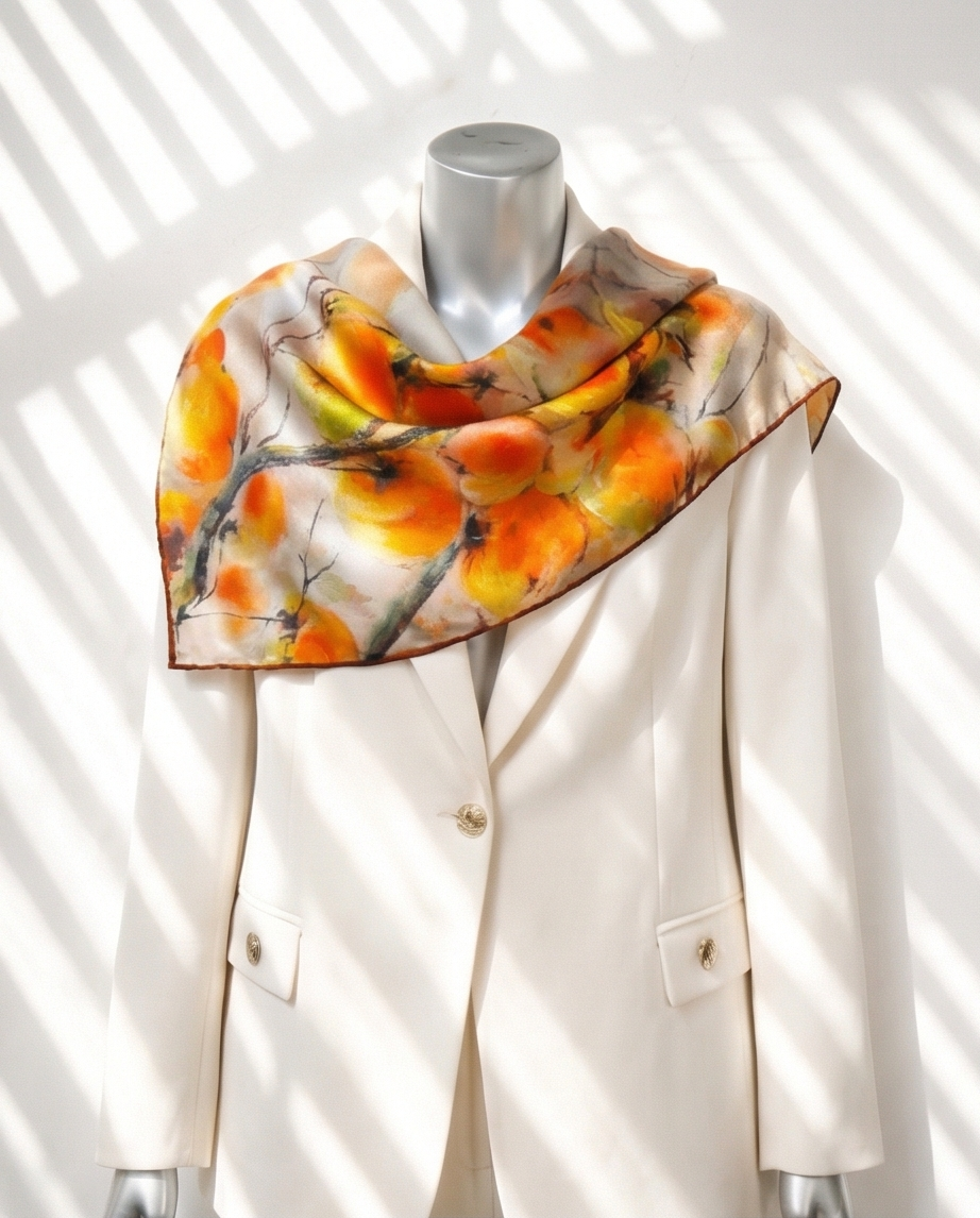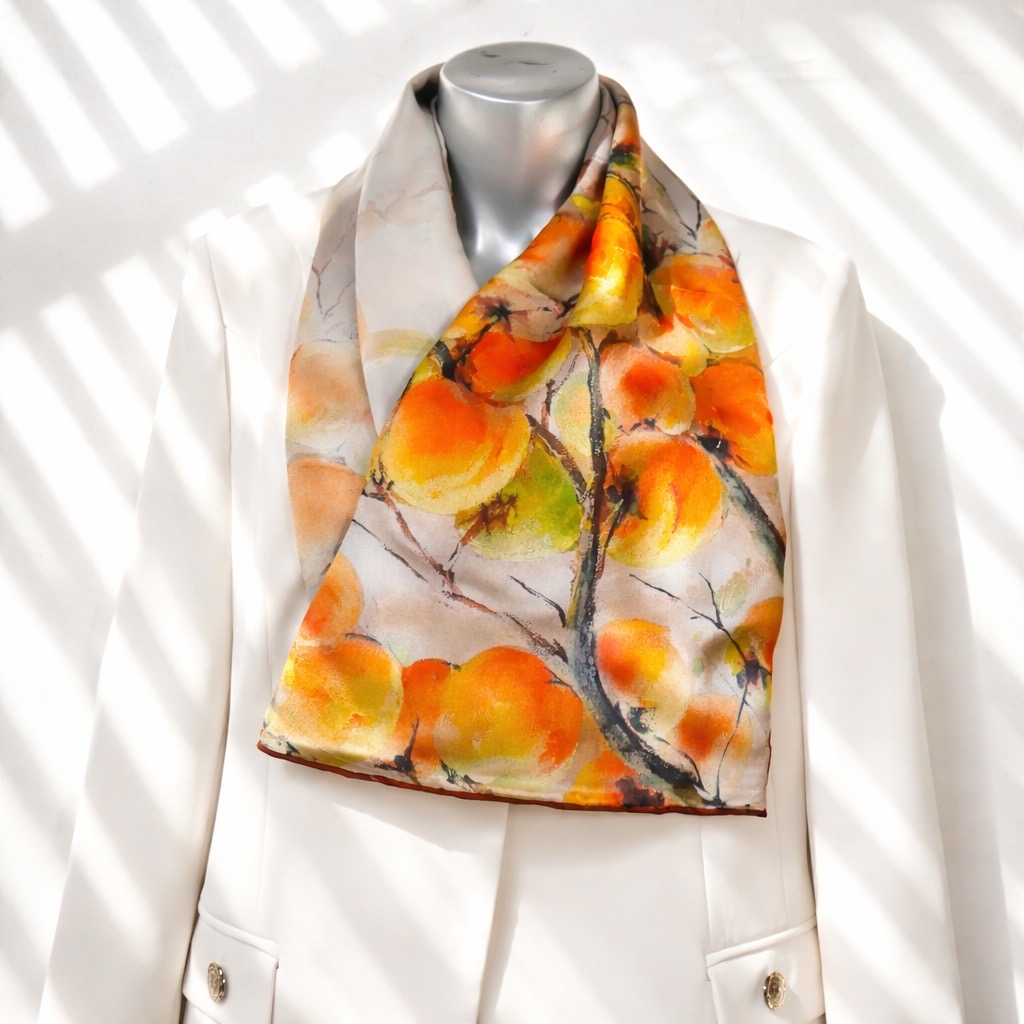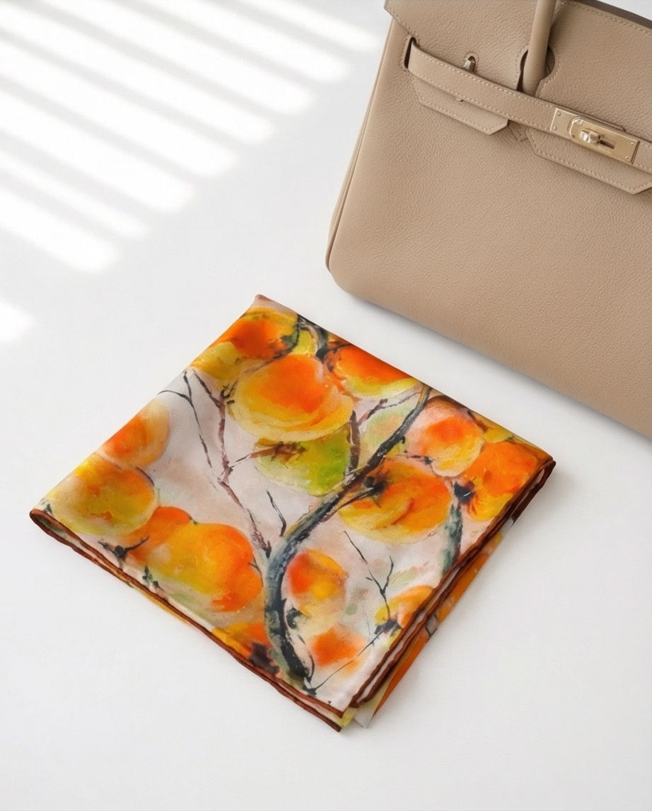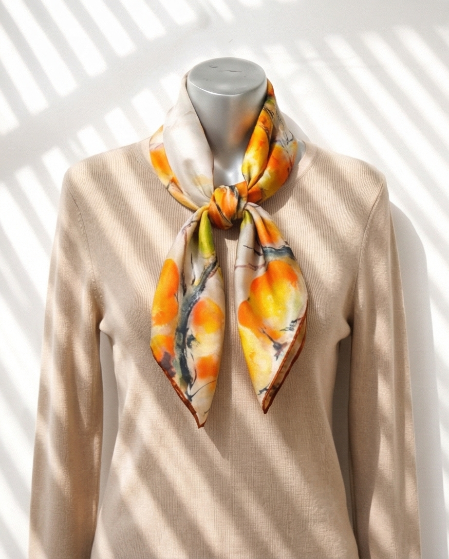 Esta echarpe quadrada mostra uma pintura artistica de frutos. É aquele detalhe  que transforma qualquer look. Pode usar de várias formas no pescoço, nos ombros ou ate no cabelo.
