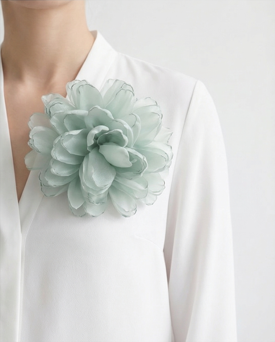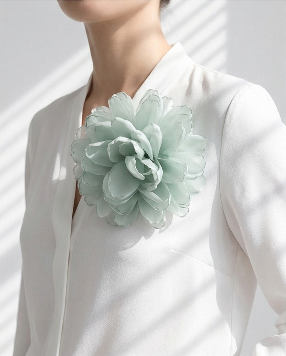 • Broche flor azul claro em tecido preso a casaco branco