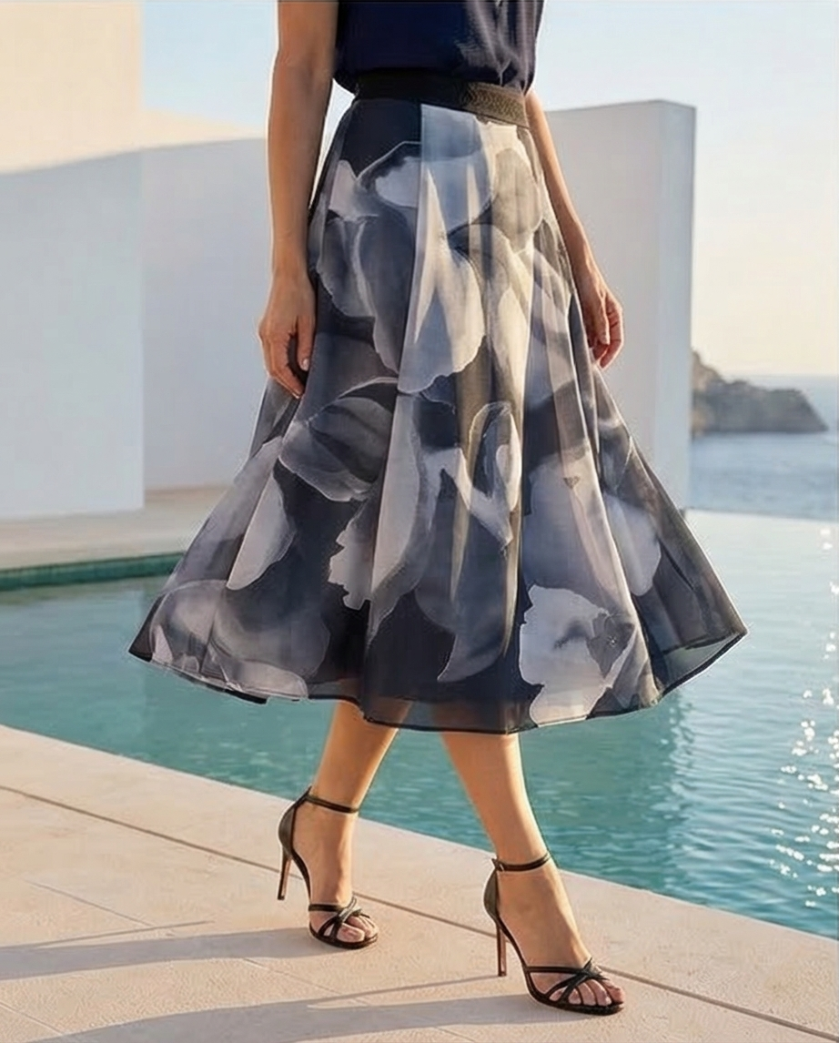Saia Magestic 189,40 € Desconto de %. Partilhar Tamanho L / XL Comprar Contactar Esta saia midi apresenta um padrão floral abstrato em tons de azul, cinzento e branco,com o corte evasê fluido, de cintura alta elástica. Ideal para diversas ocasiões desde o dia a dia até para eventos formais, oferece um look elegante e sofisticado. Pode combinar com o top Rafael