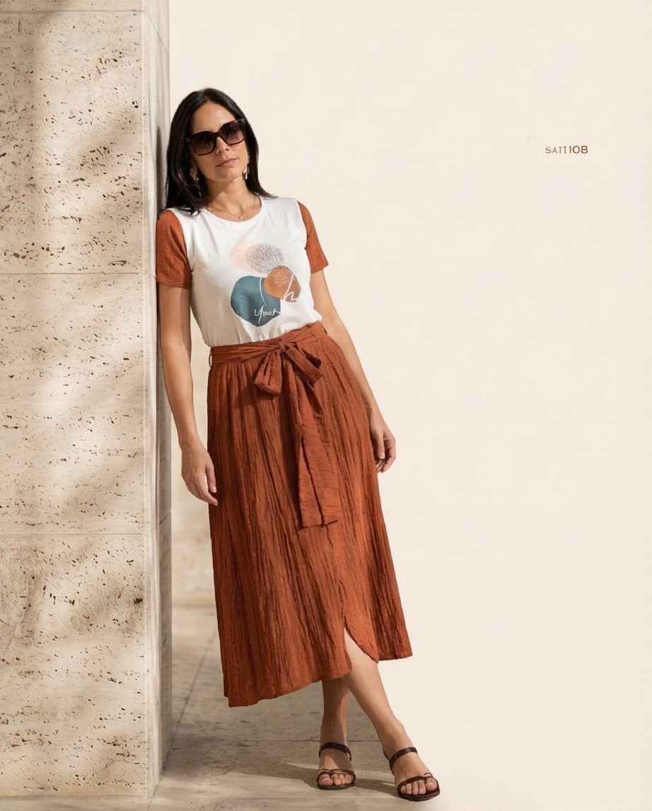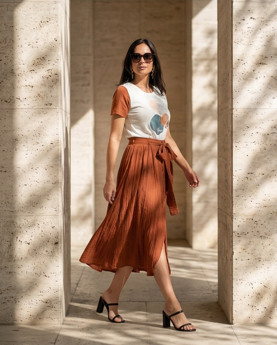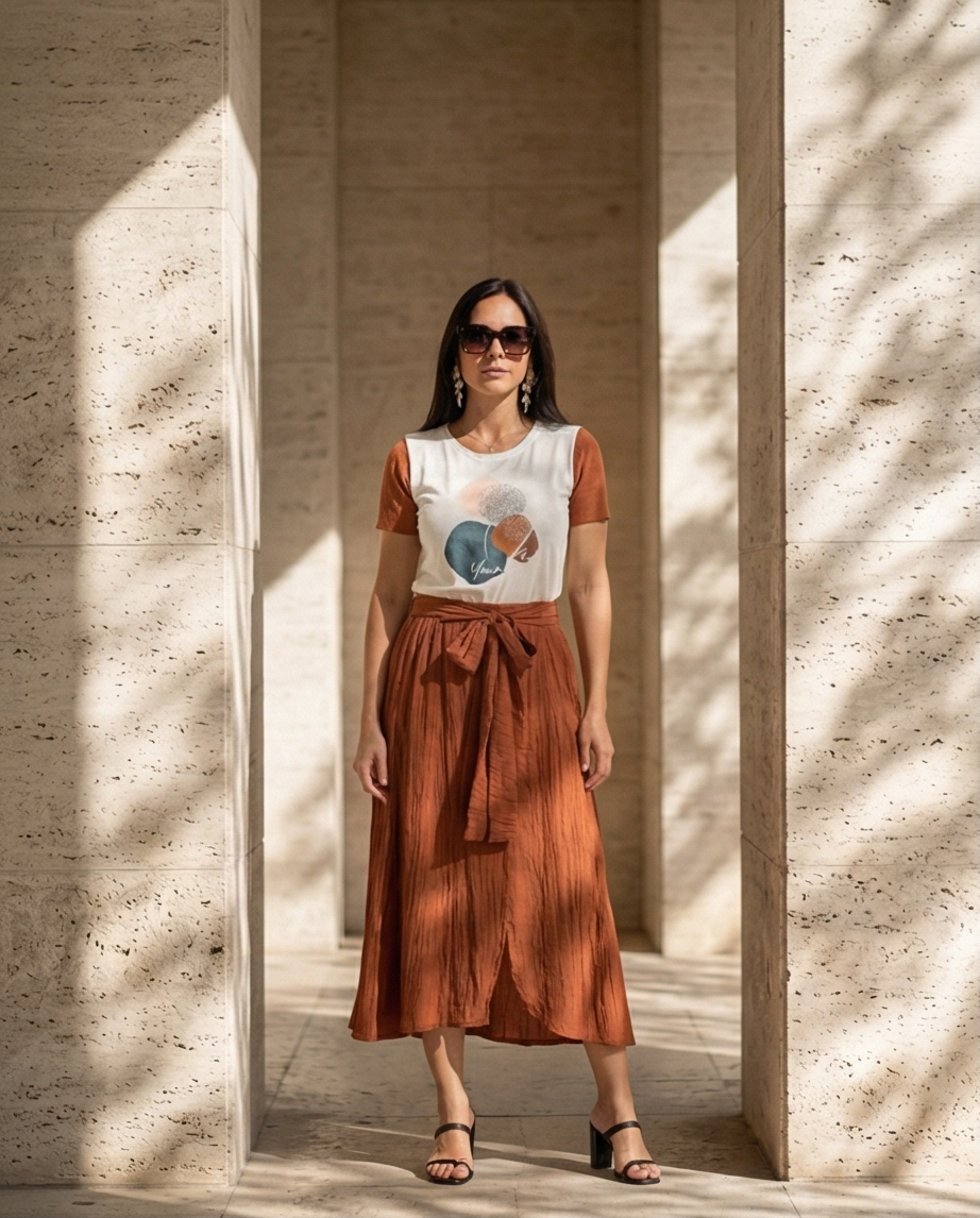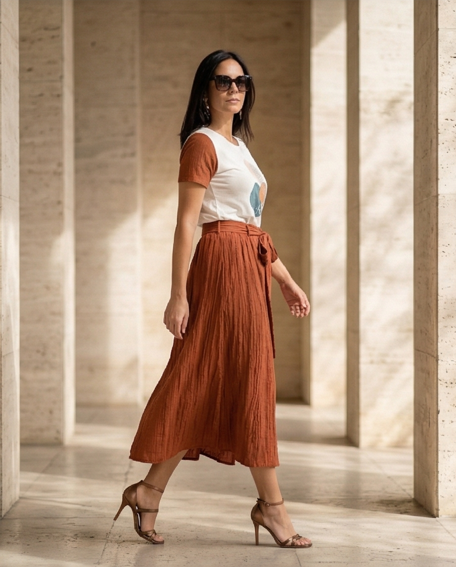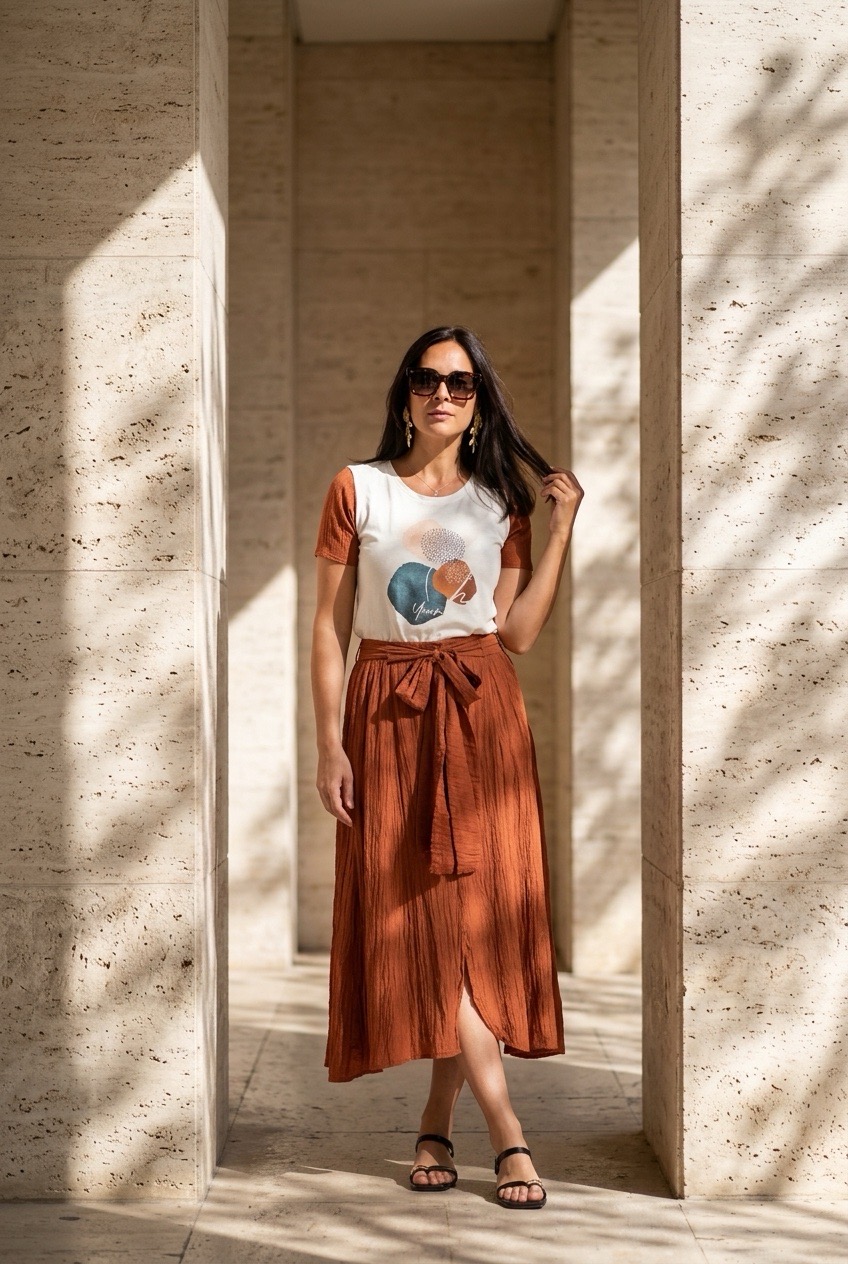 • Mulher com t-shirt branca e castanha estampada, saia midi castanha enrugada, sandálias e óculos de sol