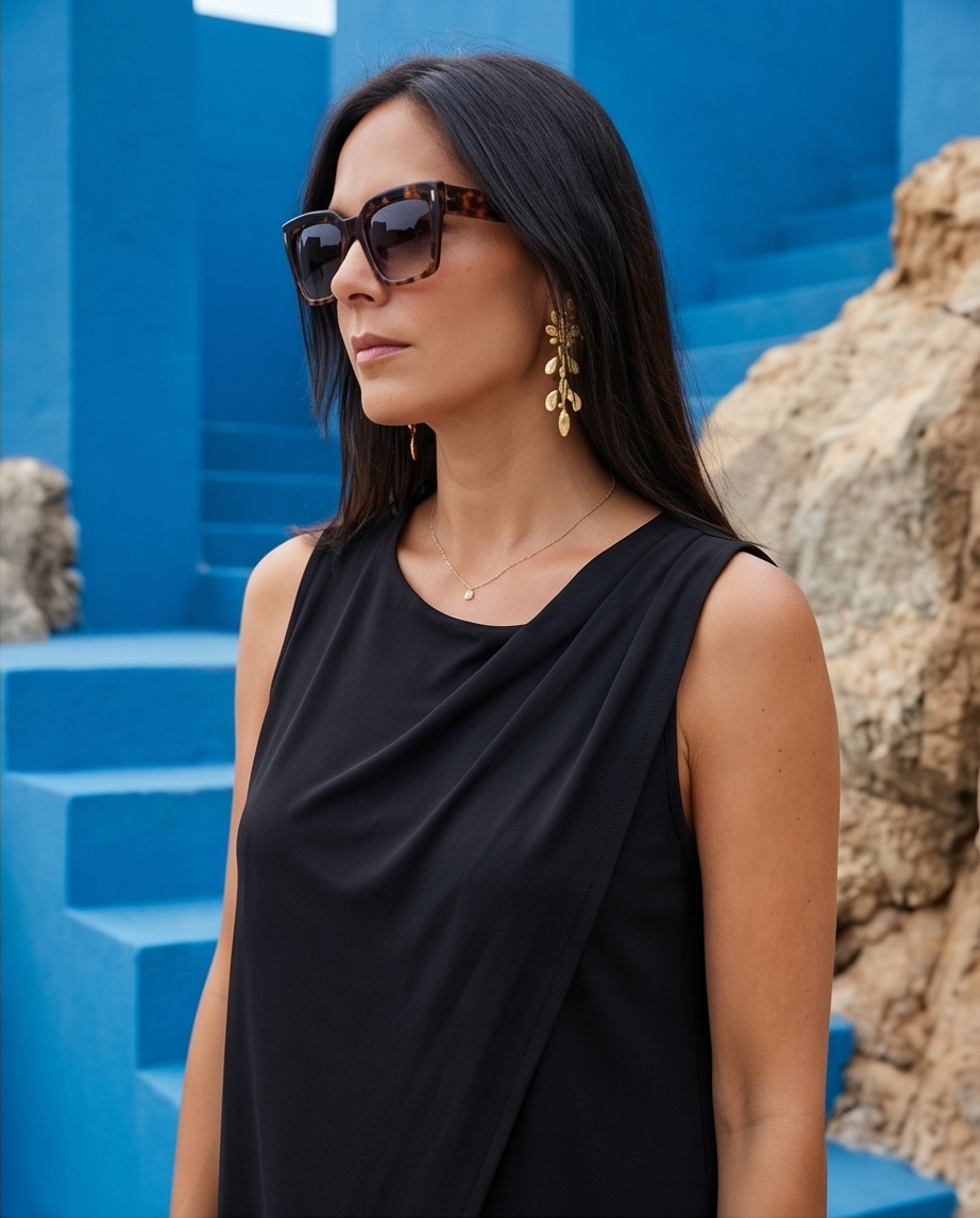• Mulher com óculos de sol padrão tartaruga e vestido preto sem mangas, brincos dourados, com fundo azul e rochas.