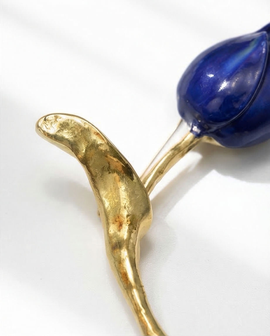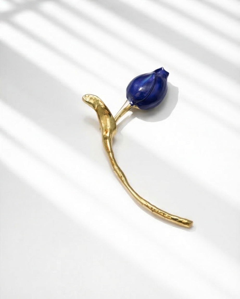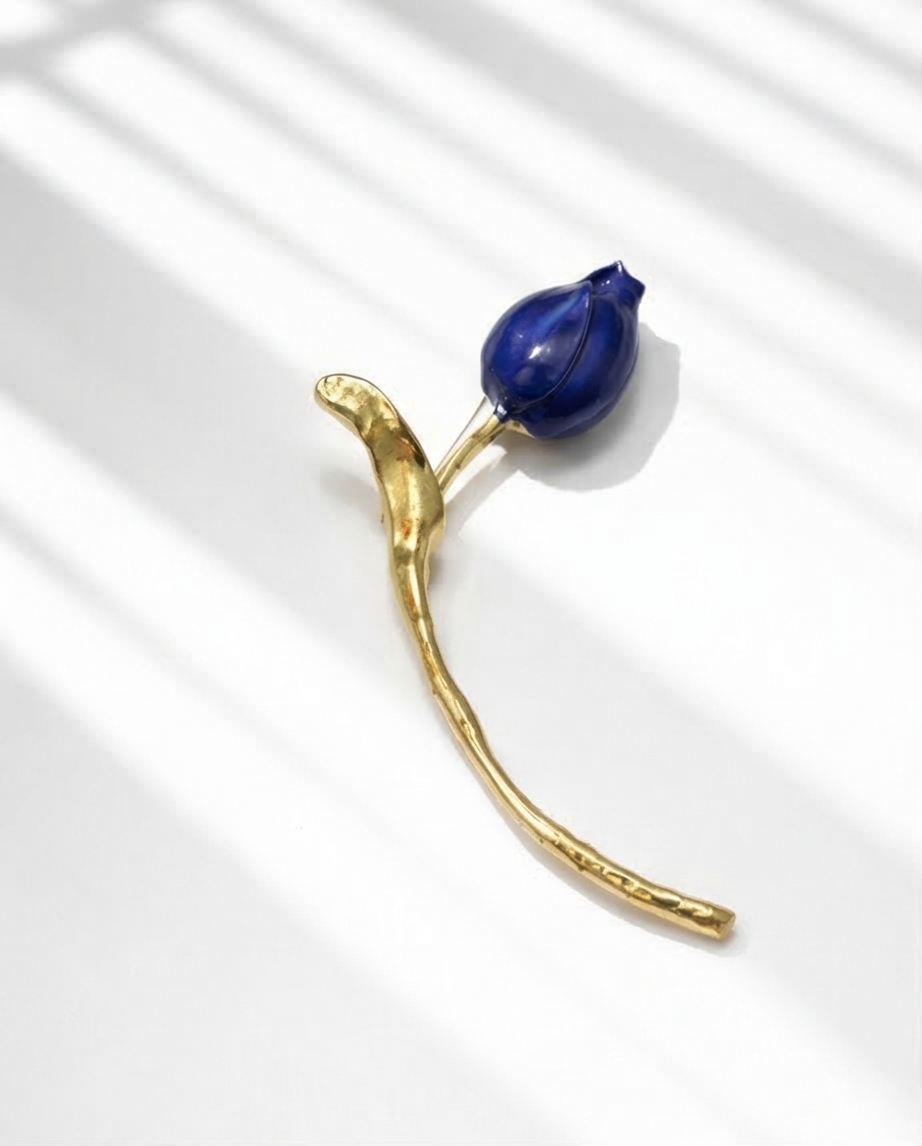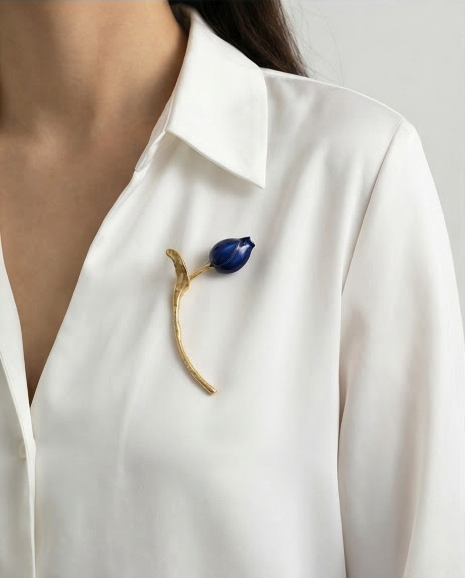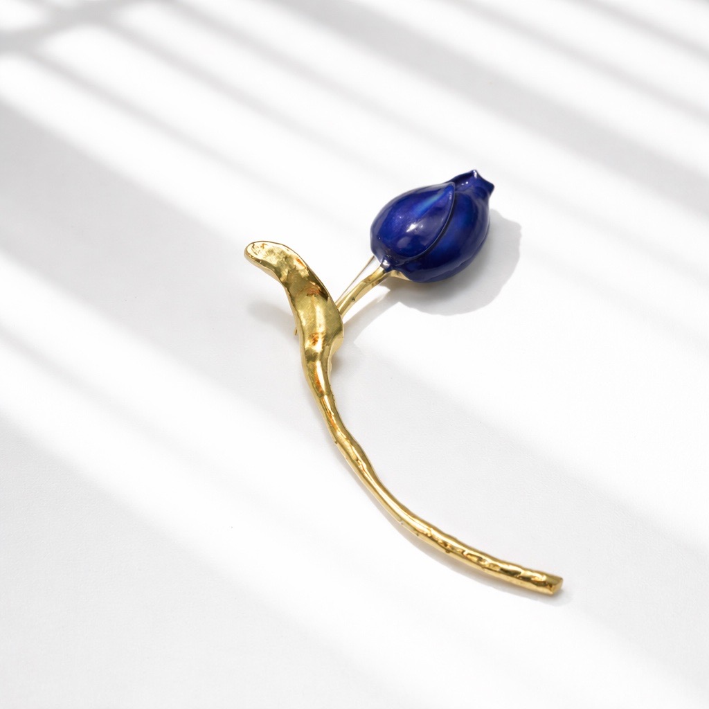 Blue Tulip 16,40 € Desconto de %. Partilhar Comprar Contactar É um alfinete de peito com desing de botão de tulipa azul estilizado com haste longa e curvilínea em dourado. Ideal para complementar roupas sofisticadas.