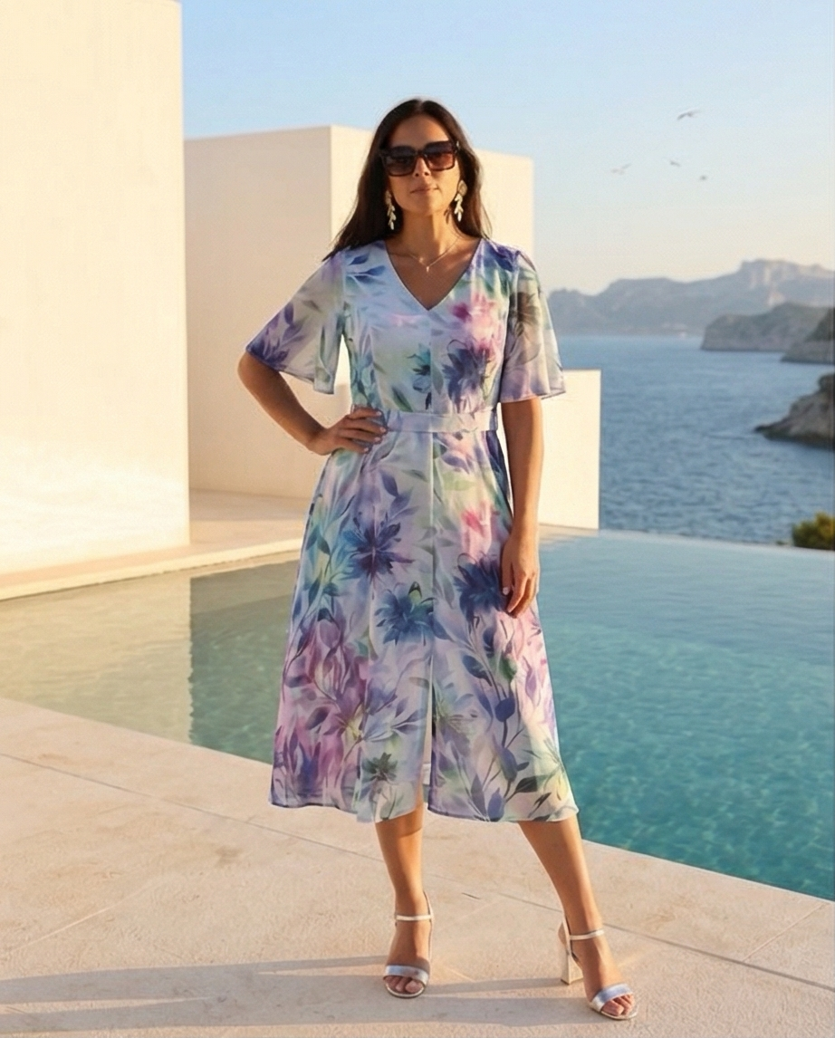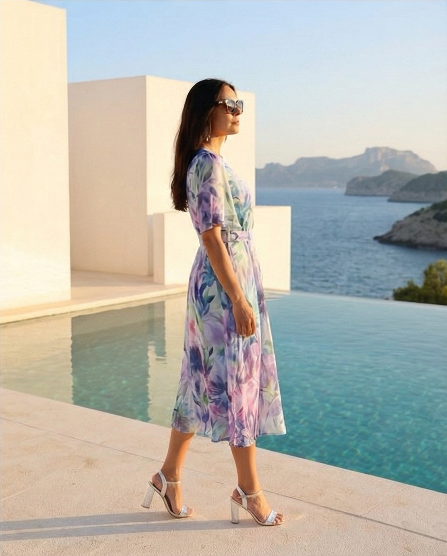 • Mulher com vestido floral midi e sandálias brancas junto a piscina com vista para o mar