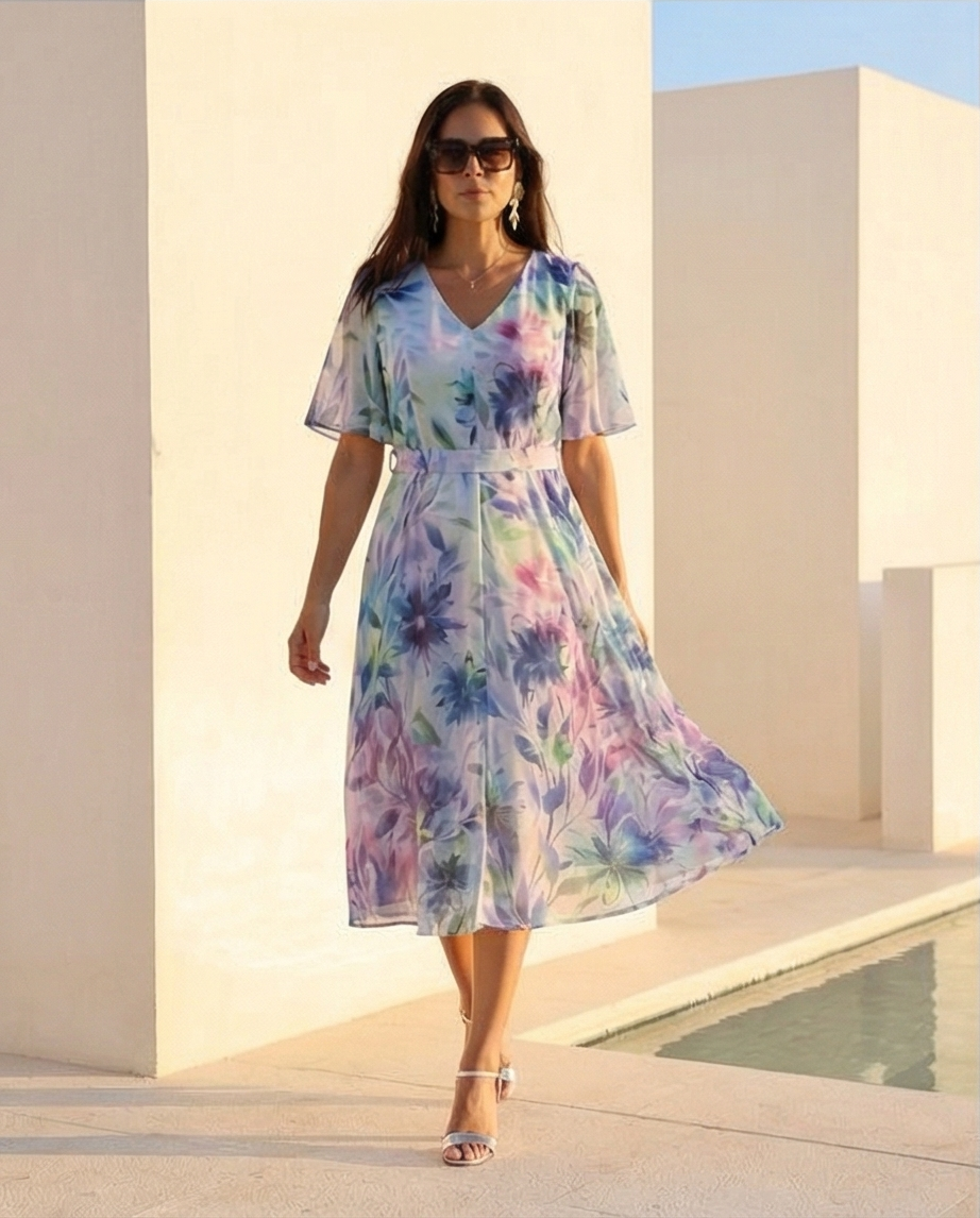 • Vestido midi floral em tecido leve com cinto, usado em ambiente exterior minimalista