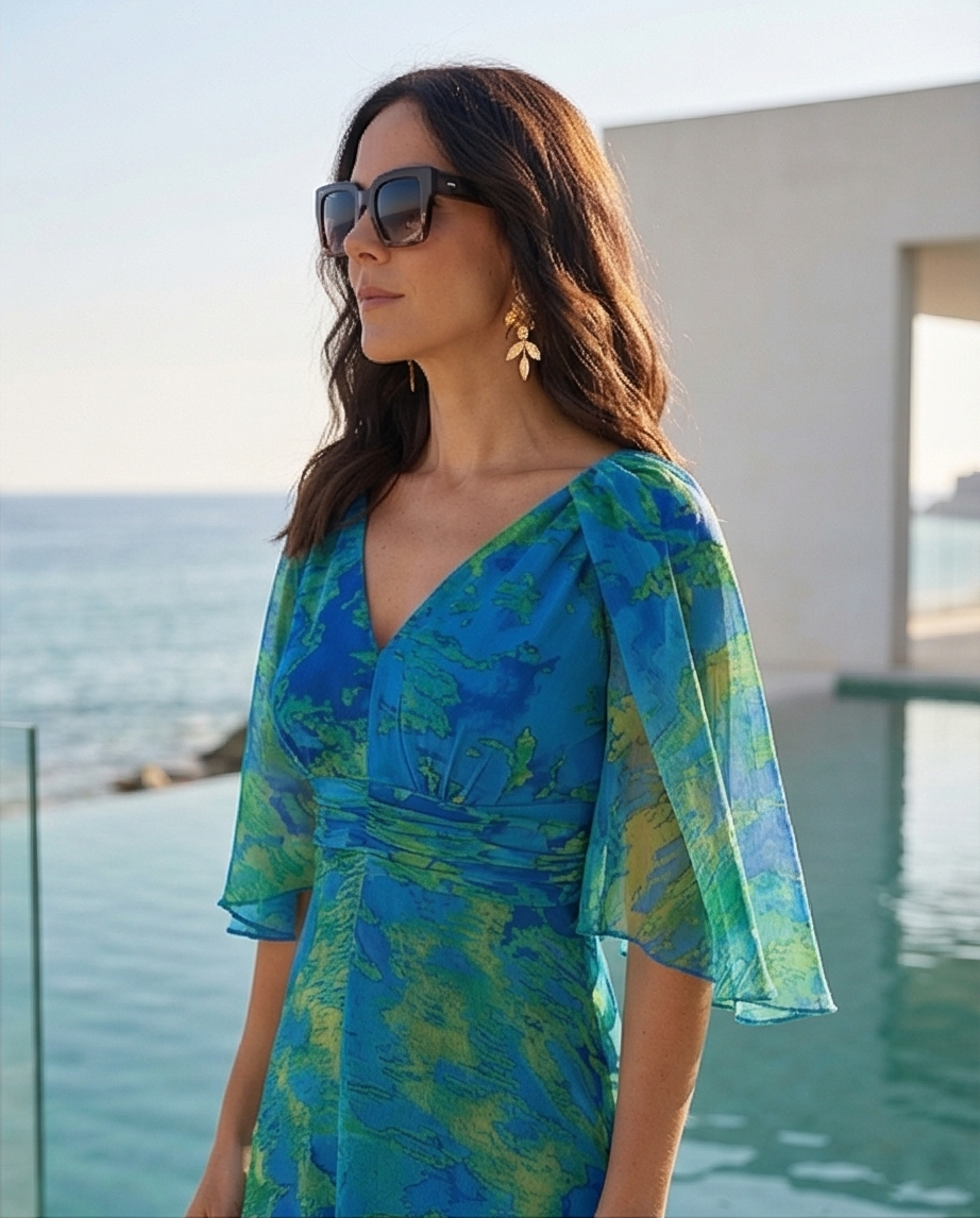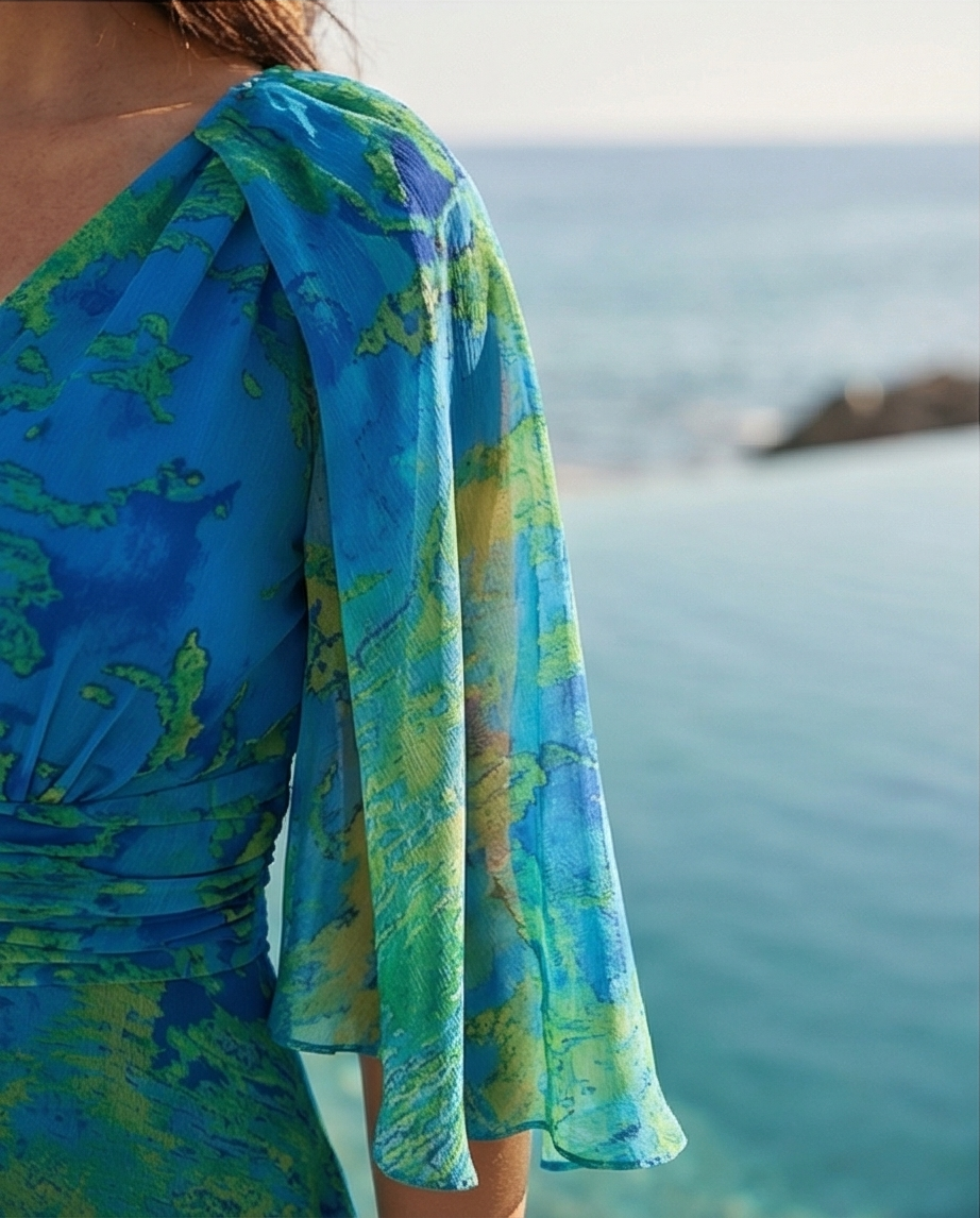 • Vestido midi azul com padrão verde, mangas transparentes, decote em V, vista para o mar e piscina