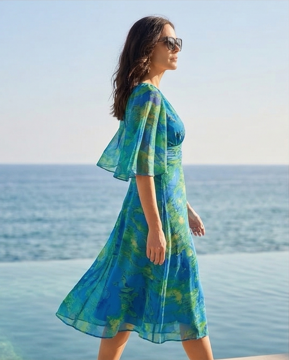 • Vestido azul e verde com padrão fluído e mangas largas em ambiente marítimo