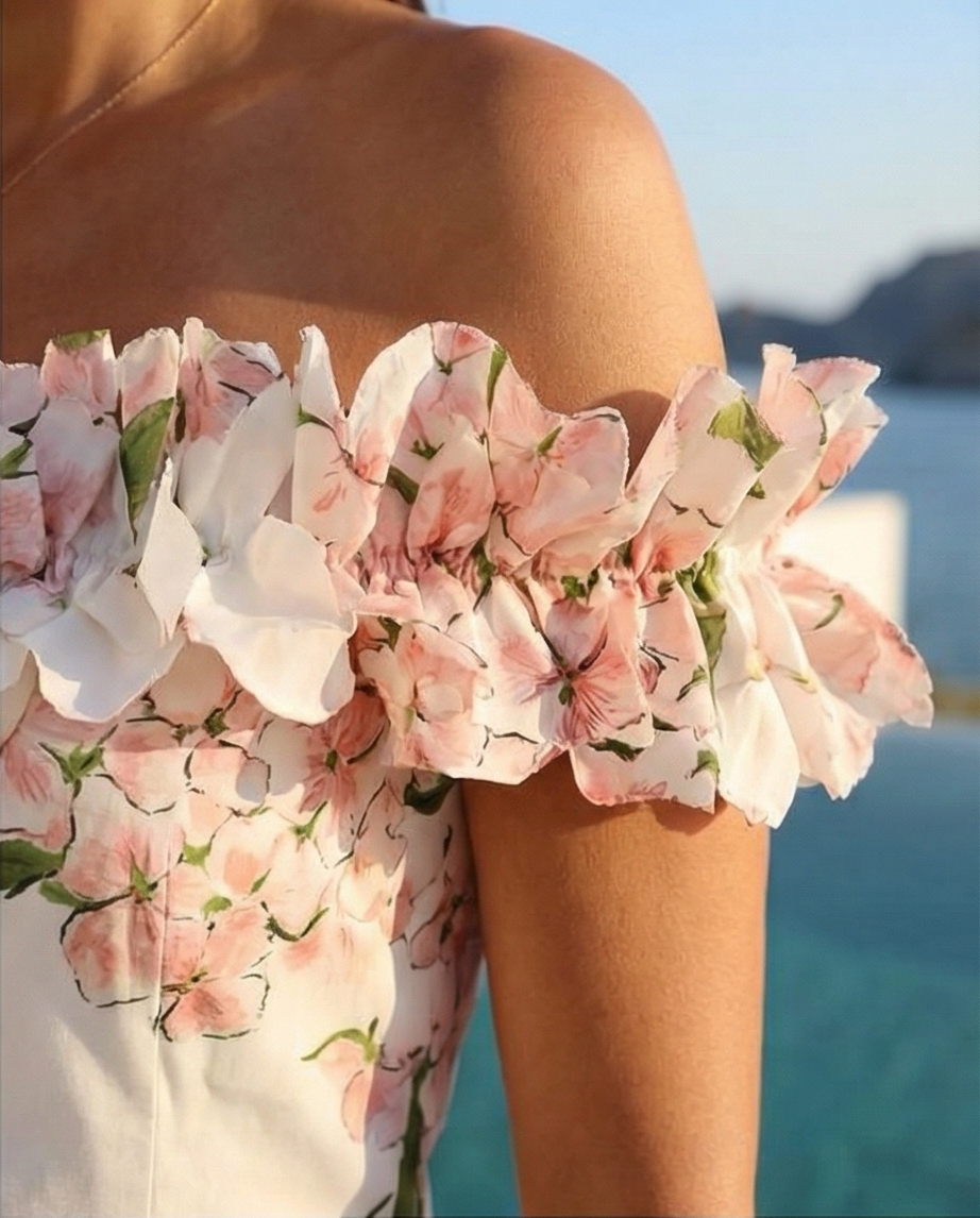 • Vestido longo floral ombro a ombro com babados e óculos escuros