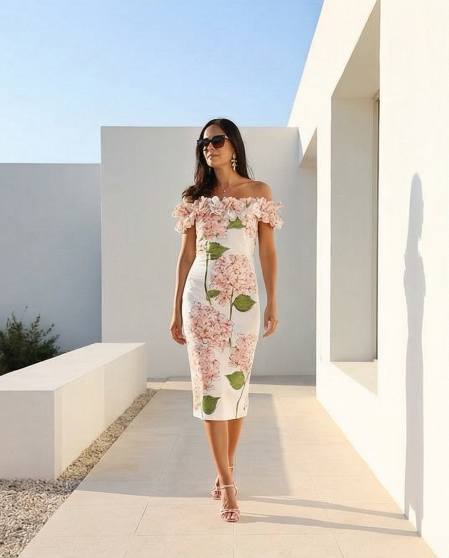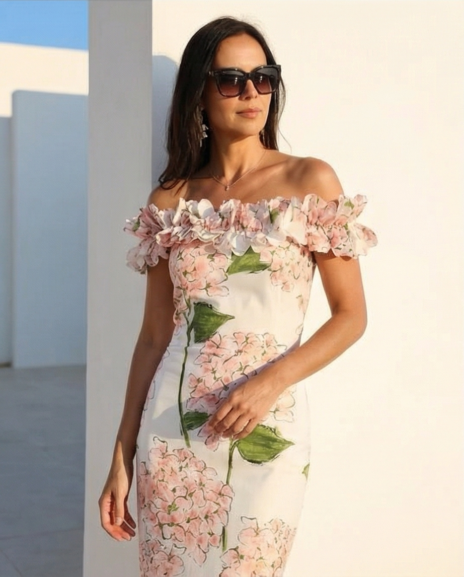 Este fantastico vestido midi como decote de ombros descobertos, tem folhos na zona do peito que criar uma textura tridimensional. O padrão floral delicado em hortênsias em tons de rosa e verde num fundo branco.
