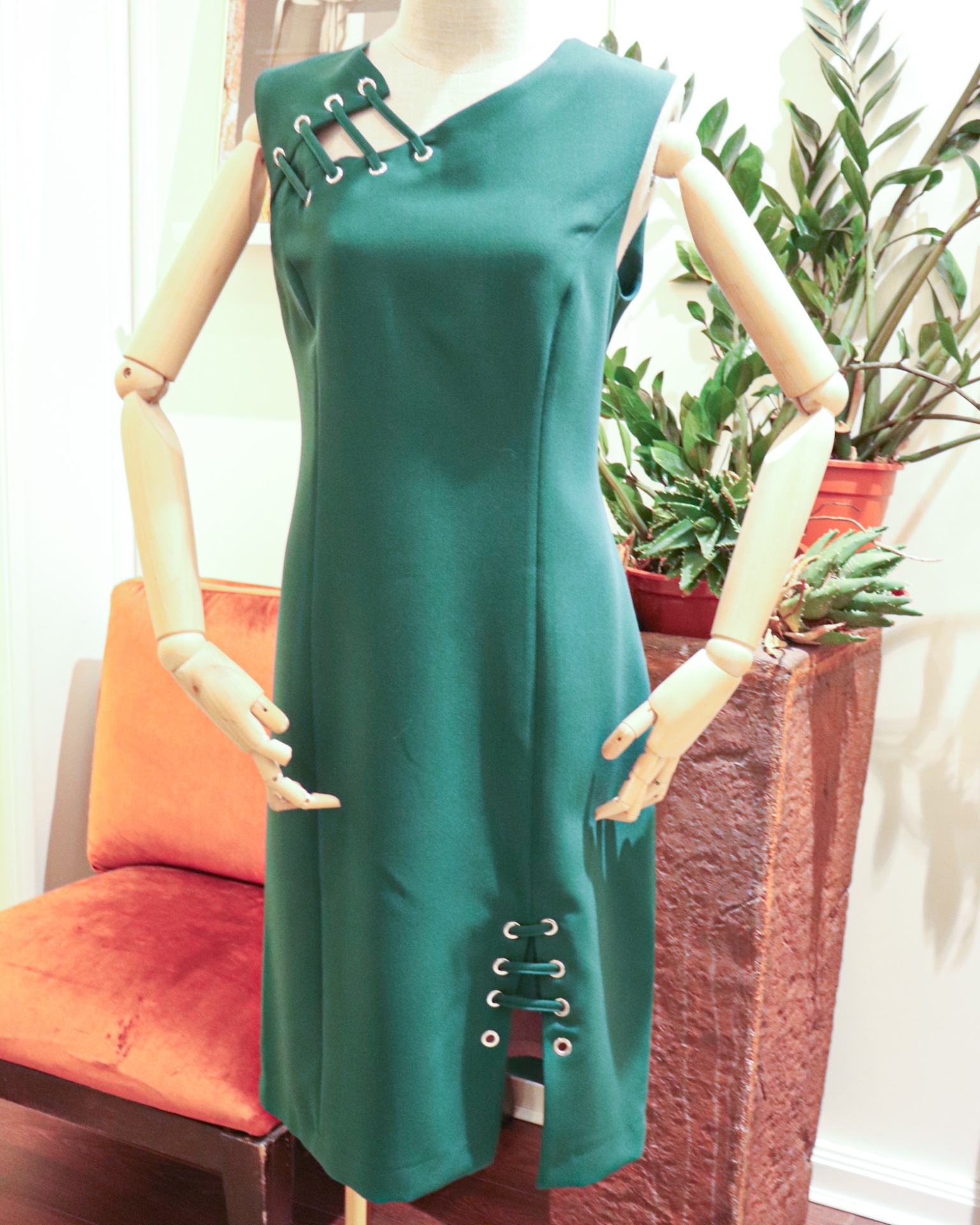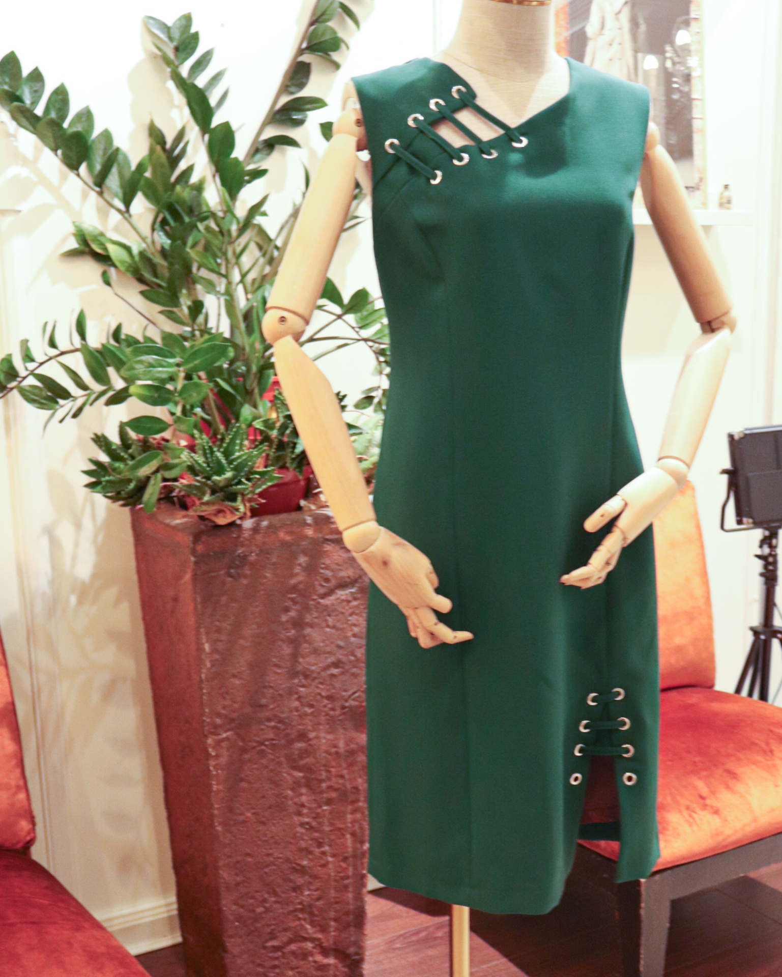• Vestido verde escuro com ilhóses e cordões em um manequim diante de cadeira laranja e plantas.