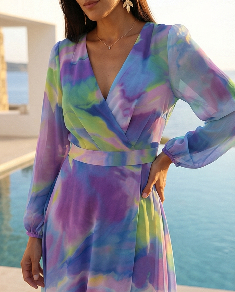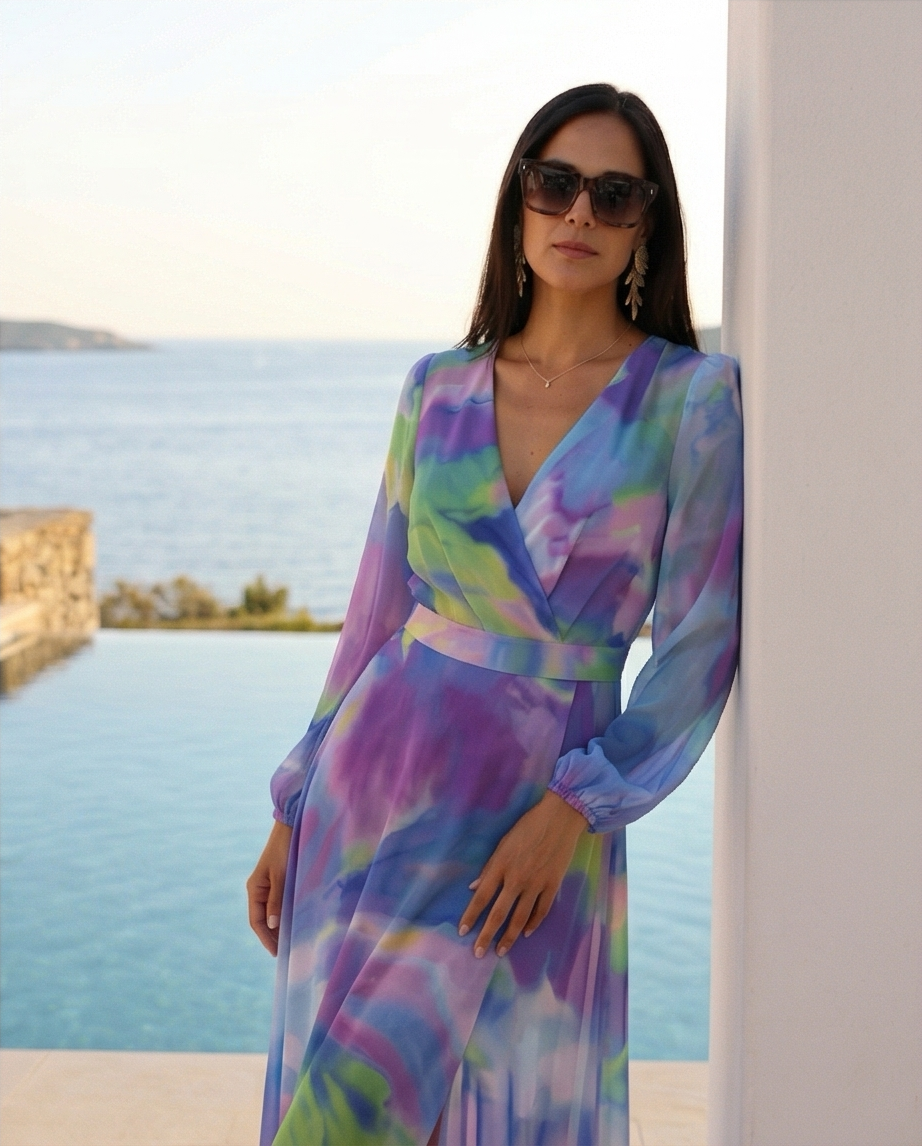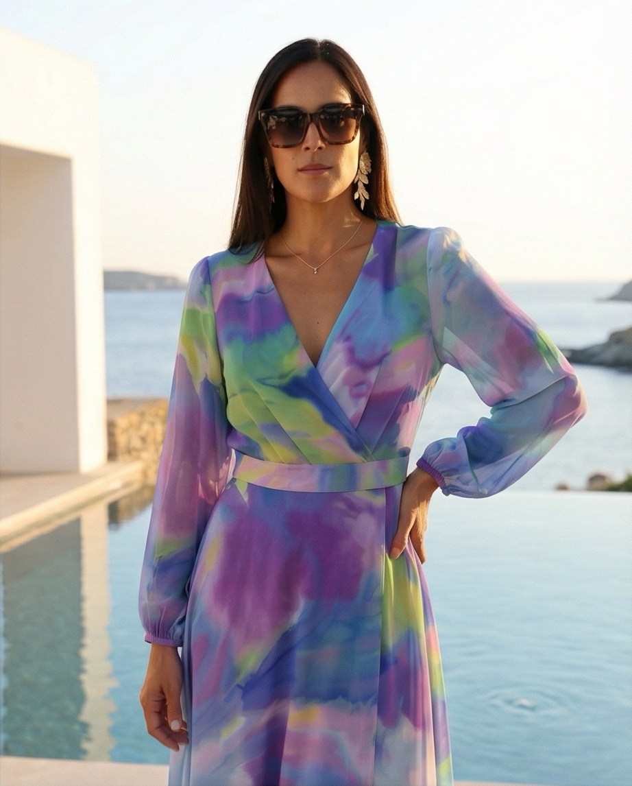 Mulher com vestido longo colorido ao lado de uma piscina com vista para o mar Vestido Candy comprido 299,40 € Desconto de %. Partilhar Tamanho M XL Comprar Contactar Vestido comprido, com manga, decote em V, racha lateral. cinto em tecido igual ao vestido + cinto em flores. Cores: violeta, azuis e verdes. 100%Polyester