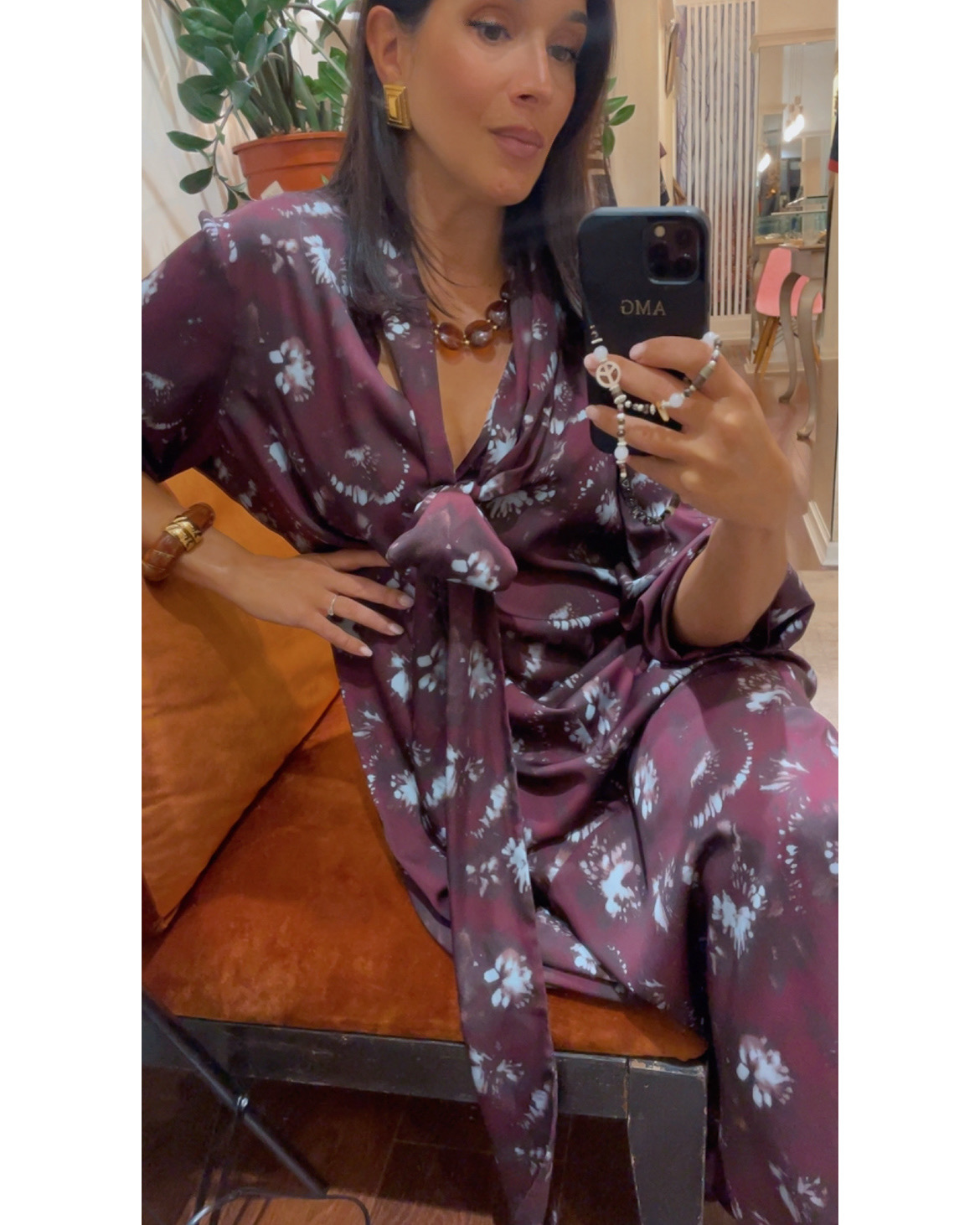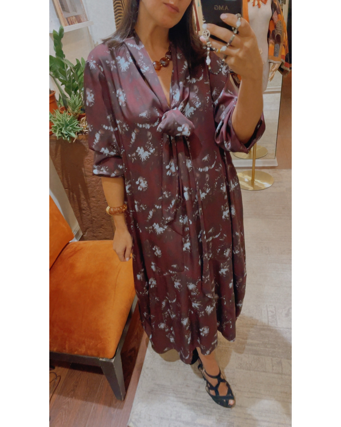 Vestido Charlotte 165,40 € Desconto de %. Partilhar Comprar Contactar Vestido fluido e elegante, tem um padrão floral abstrato. Possui uma gola que pode dar um laço no pescoço, adicionando um toque sofisticado à peça. Cor: Bordô e branco. Tamanho -S/M