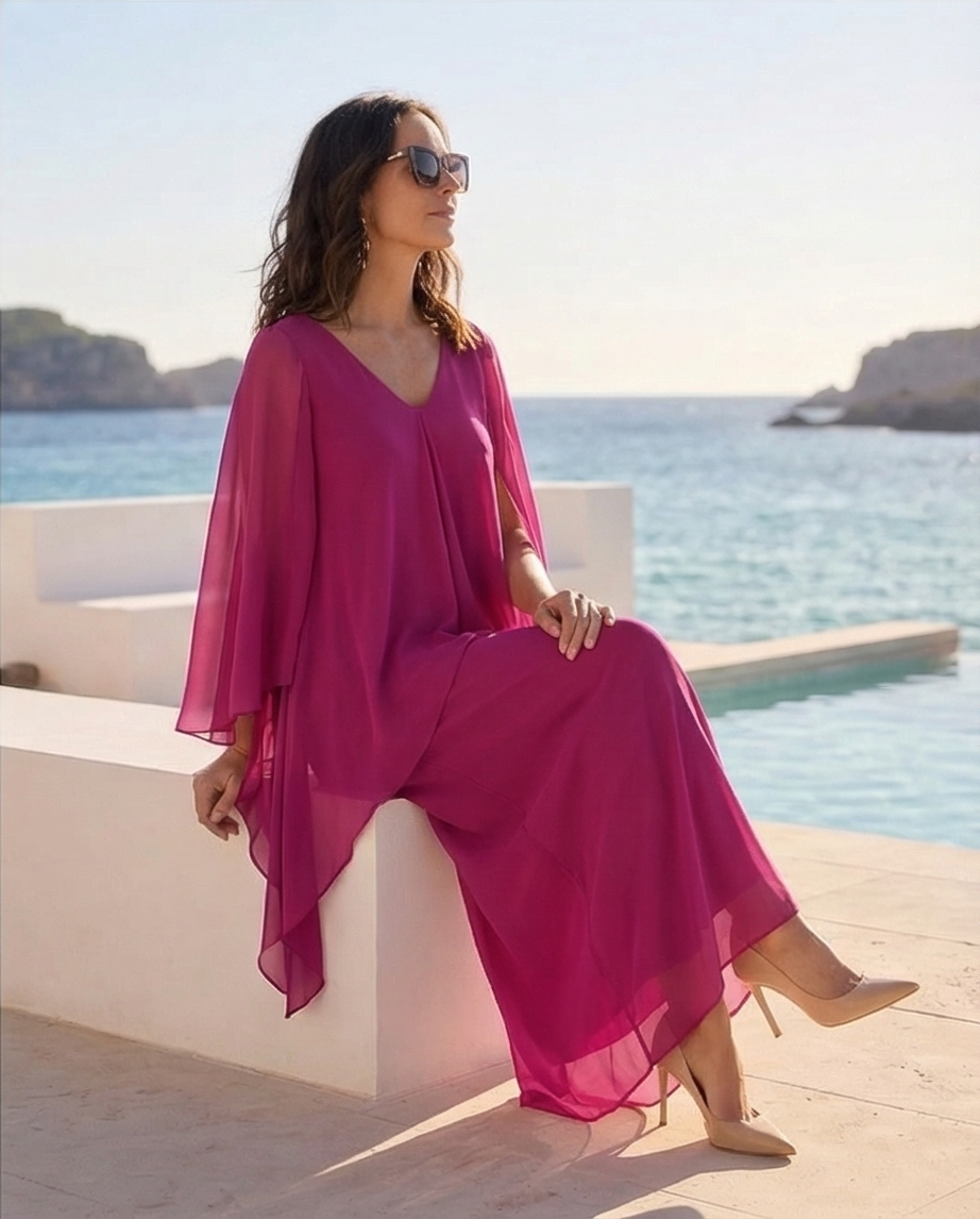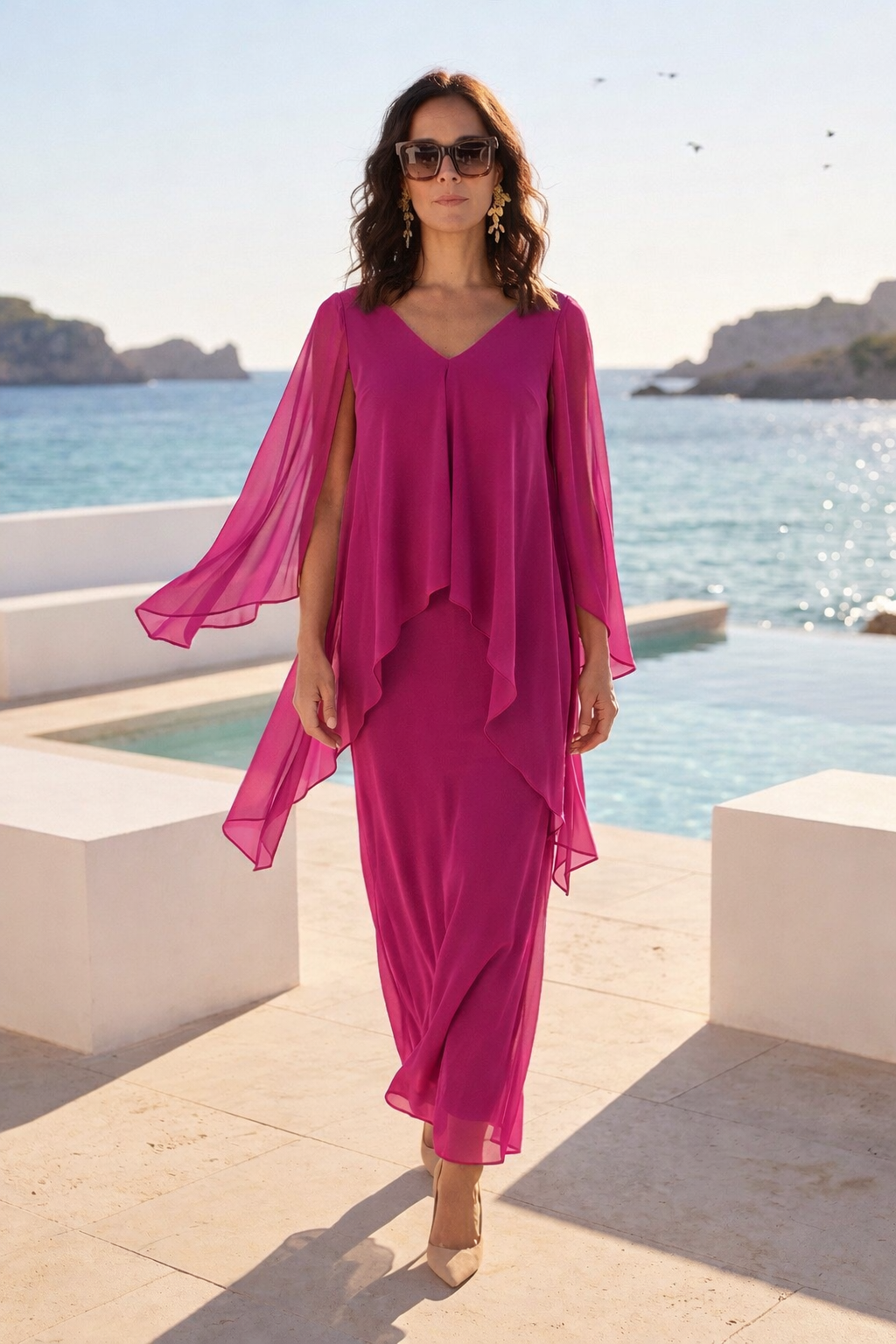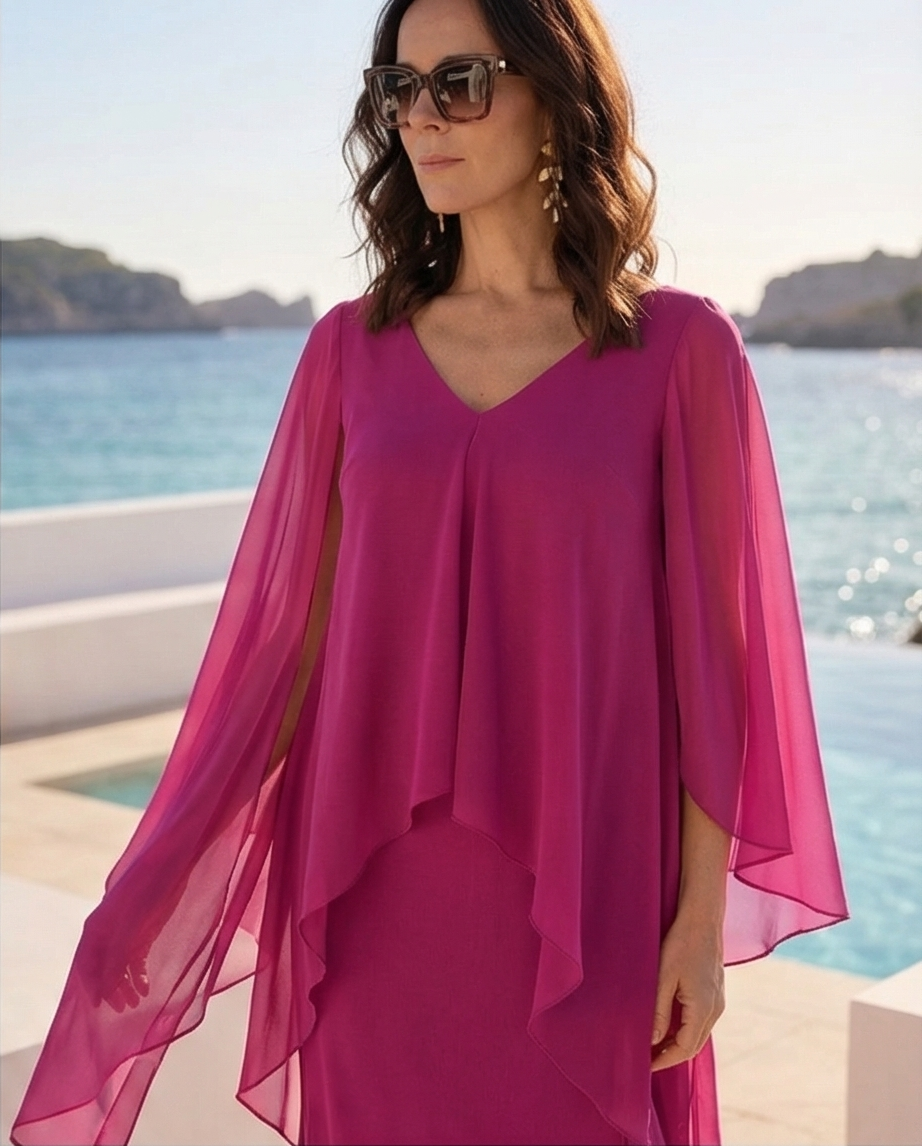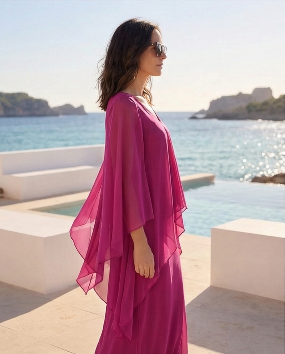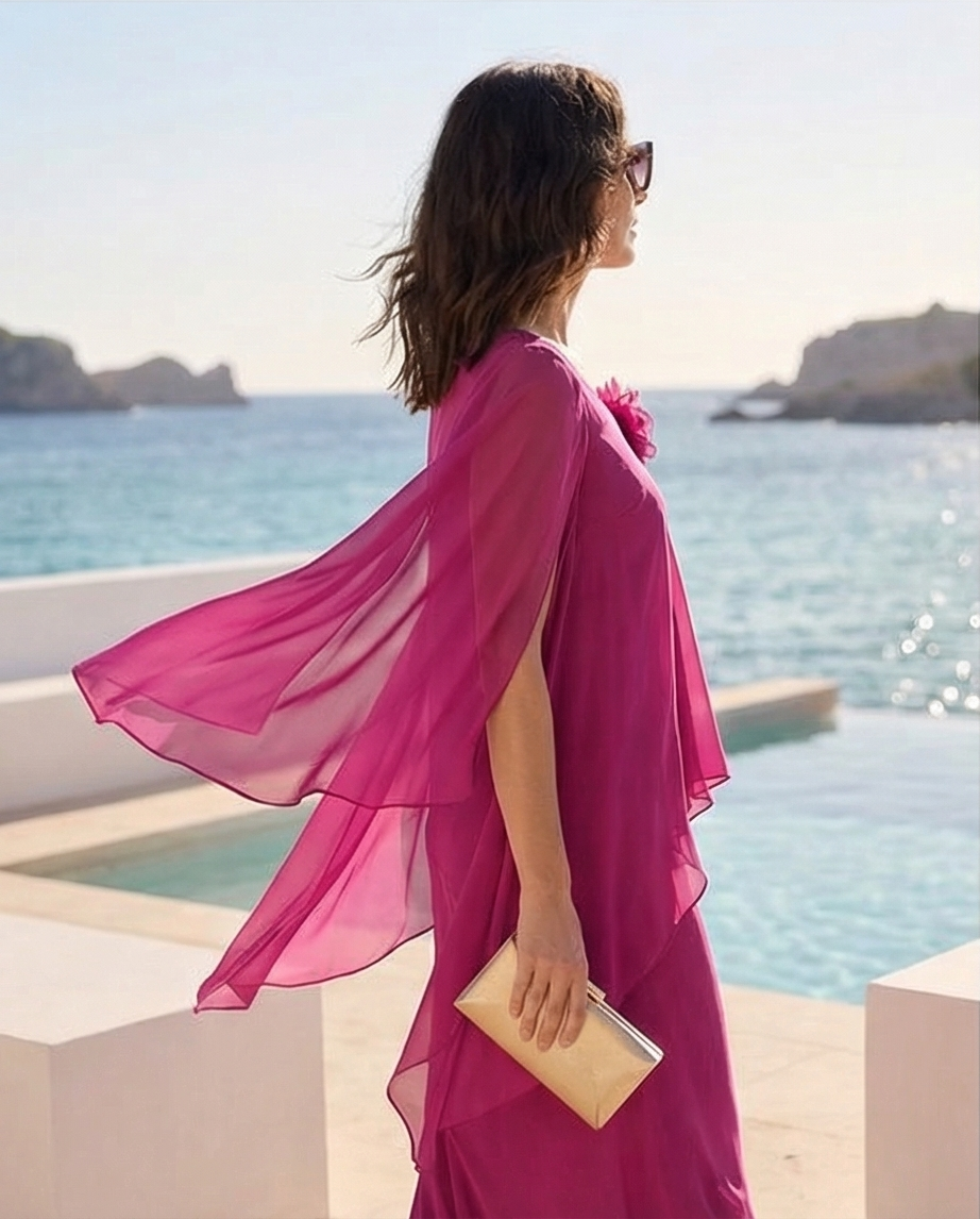Mulher com vestido longo rosa junto ao mar com óculos escuros. Vestido Colombo 159,40 € Desconto de %. Partilhar Tamanho L / XL Comprar Contactar Este vestido é elegante fluido caracterizado por uma sobreposição tipo capa que cria um efeito de camadas e movimento. Esta peça é valorizada pela sua versatilidade e pelo corte que favorece diversos tipos de corpo sendo comuns para cerimonias, Plus size. Cor : Rosa Fúcsia