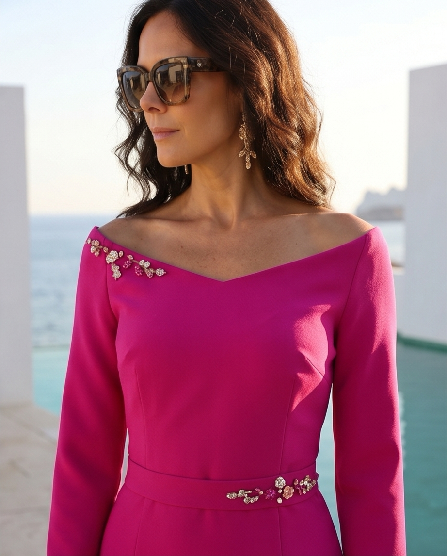 • Vestido rosa fúcsia com decote ombro a ombro e mangas compridas junto a piscina