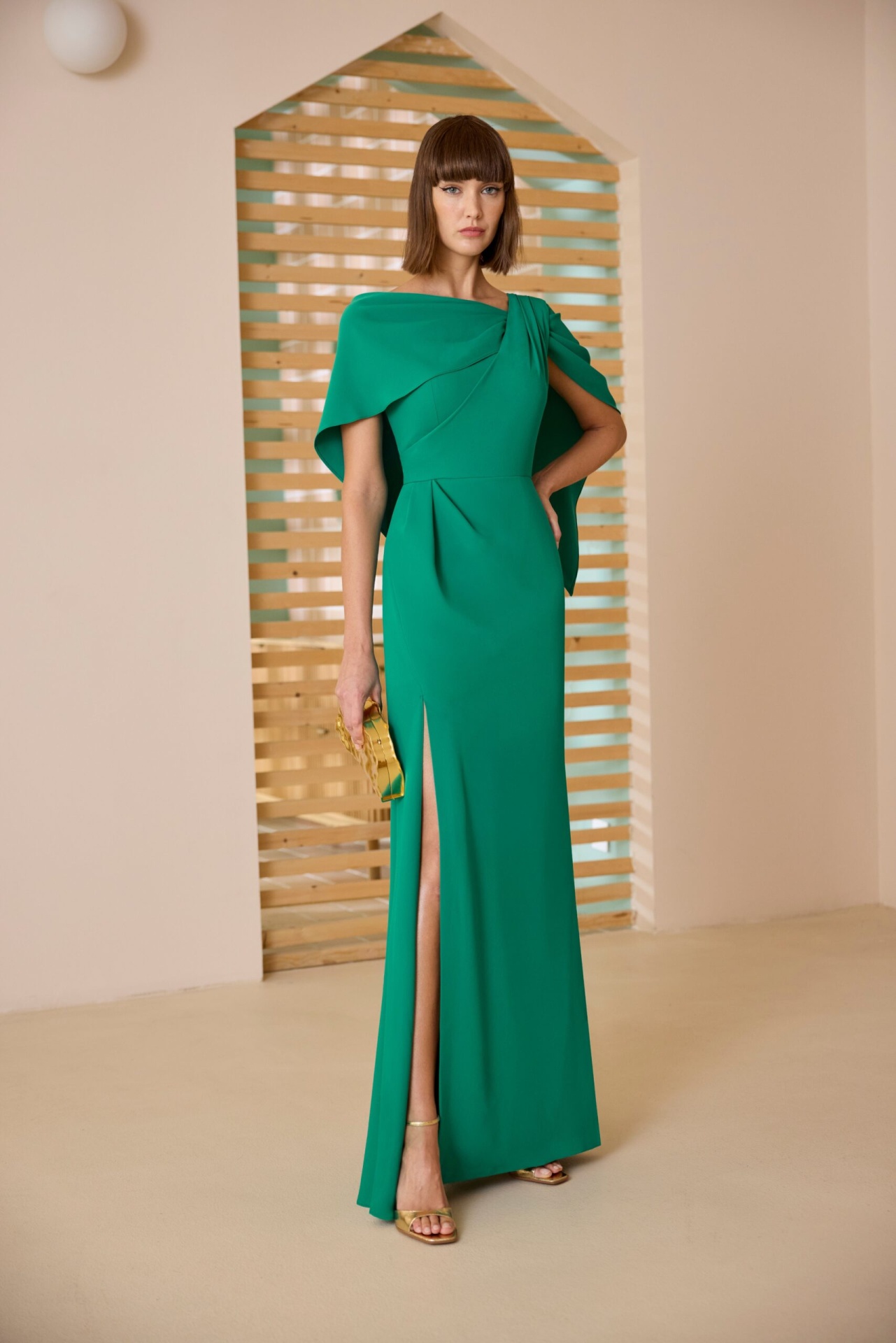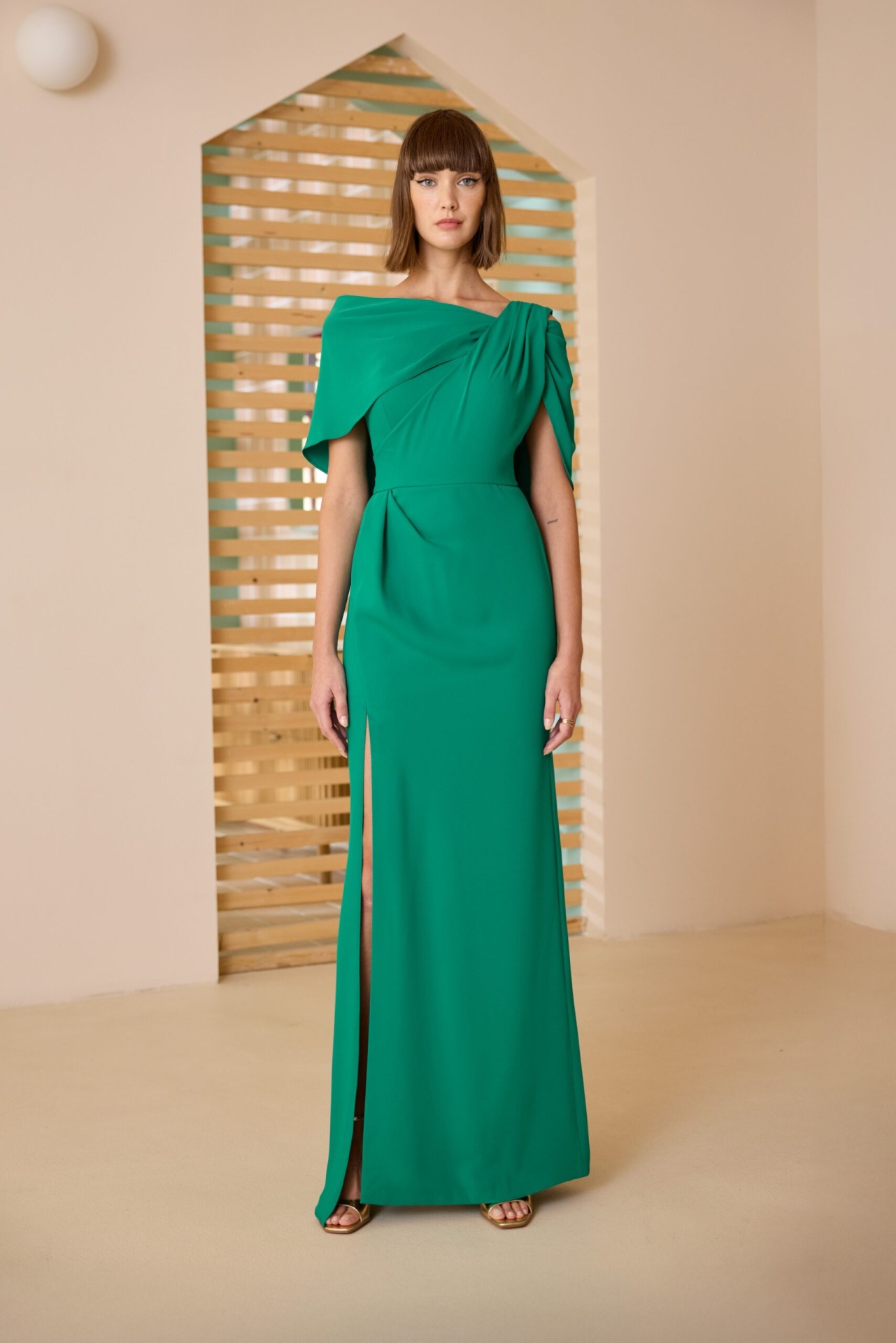 Vestido Elegance 235,00 € Desconto de %. Partilhar Comprar Contactar Este elegante vestido tem um decote assimétrico com efeito de capa sobre os ombros e uma racha lateral profunda na saia. Uma escolha lindissima para madrinhas e mães que desejam uma presença marcante e refinada para uma cerimonia especial. Cor: Verde