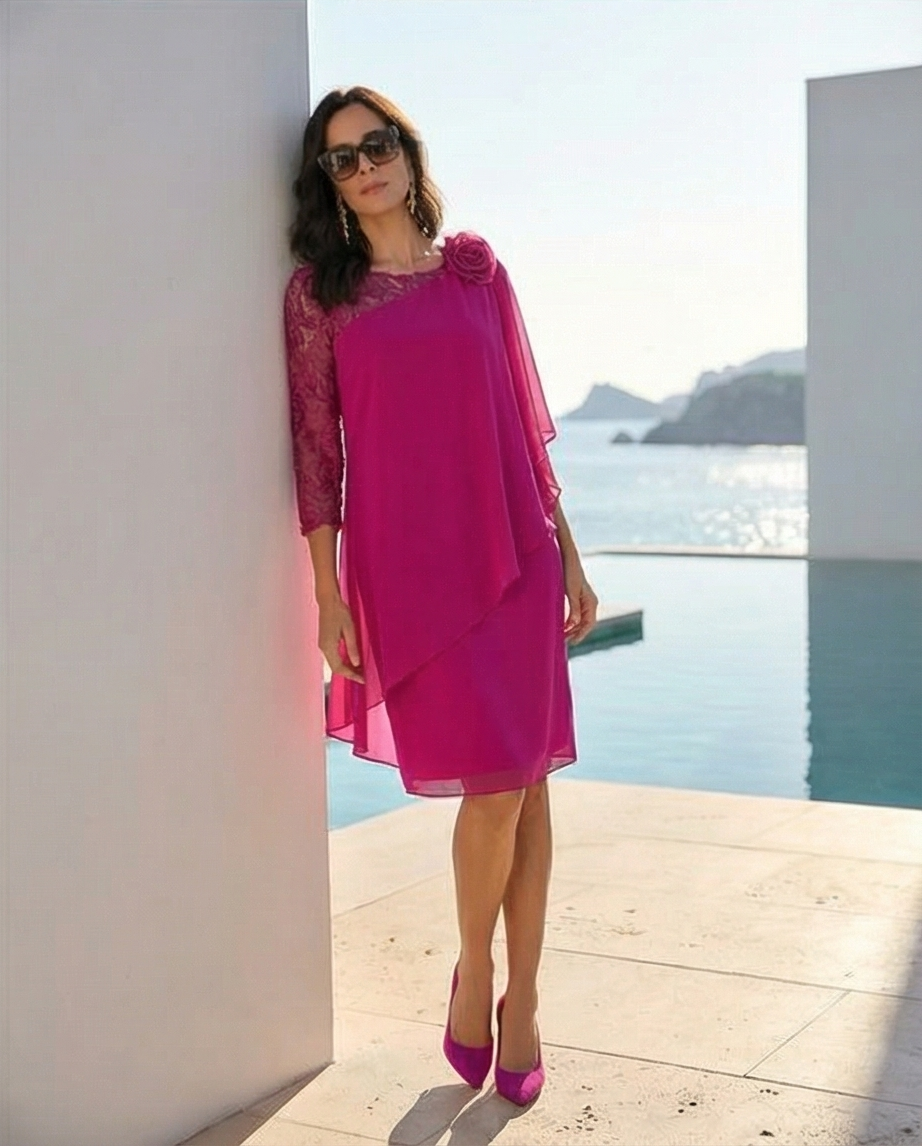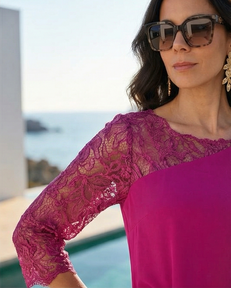 Mulher com vestido rosa e renda junto a piscina e mar ao fundo Vestido Estrela 229,40 € Desconto de %. Partilhar Comprar Contactar Este vestido elegante, tem um tom vibrante fúscsia é uma escolha clássica para ocasiões formais, como casamentos ou cerimónias. Tem um corte reto com camadas sobrepostas que criam um efeito visual sofisticado. Destaca-se por uma manga de renda transparente num dos lados e um adorno floral em relevo no ombro oposto.