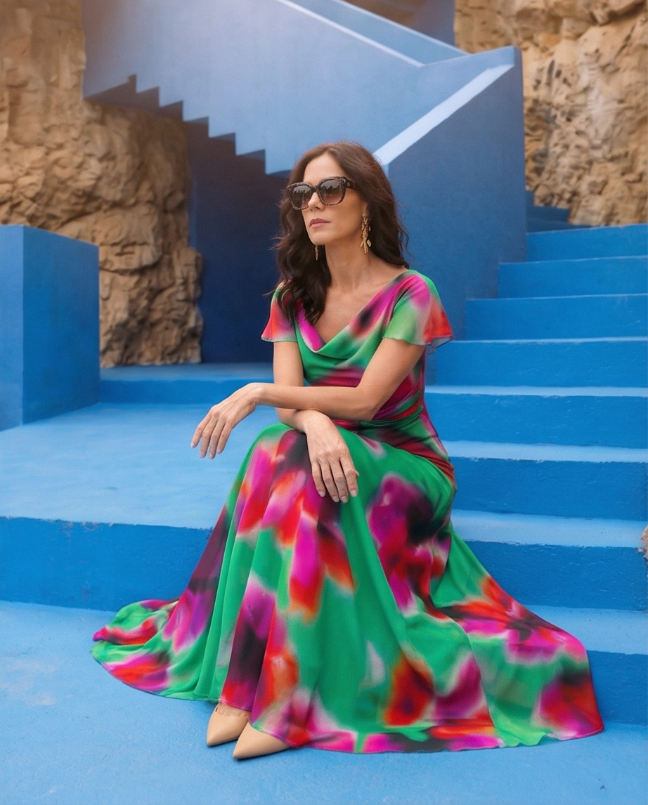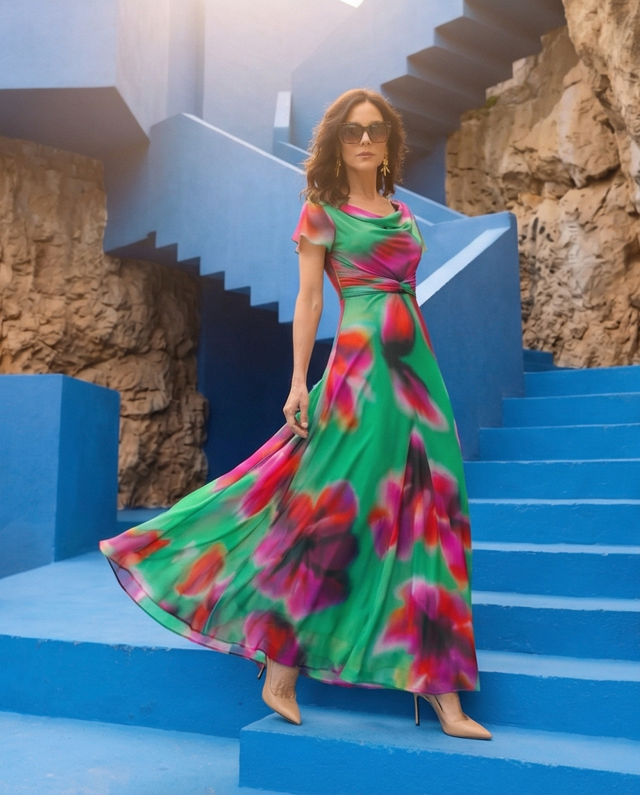 Vestido Floriane 179,40 € Desconto de %. Partilhar Tamanho L/ XL Comprar Contactar Este vestido de festa é elegante com um padrão floral vibrante em tons de verde, cor de rosa e roxo. Tem um pormenor de nó na cintura que realça a silhueta, manga fluidas e um decote cruzado. Este estilo de vestido é ideal para eventos de Primavera ou Verão, como casamentos ou festas ao ar livre devido ao seu tecido leve.