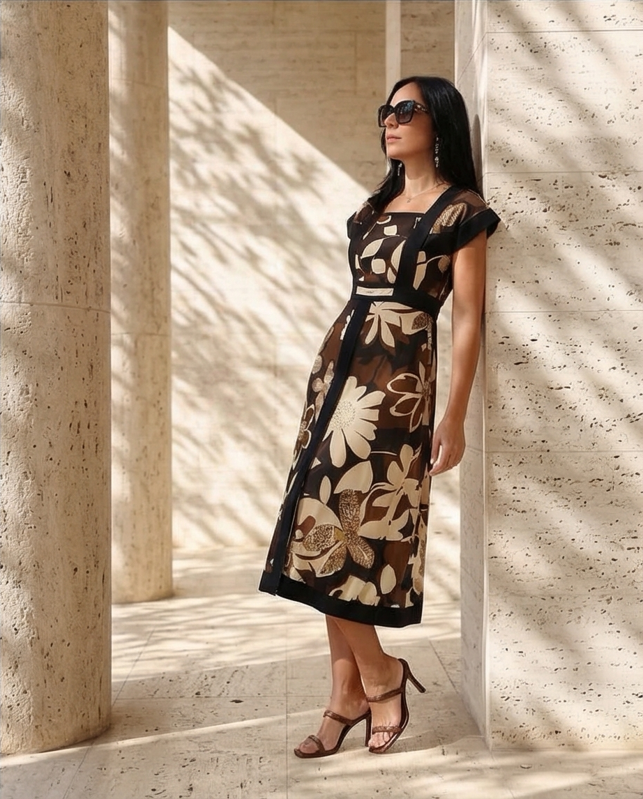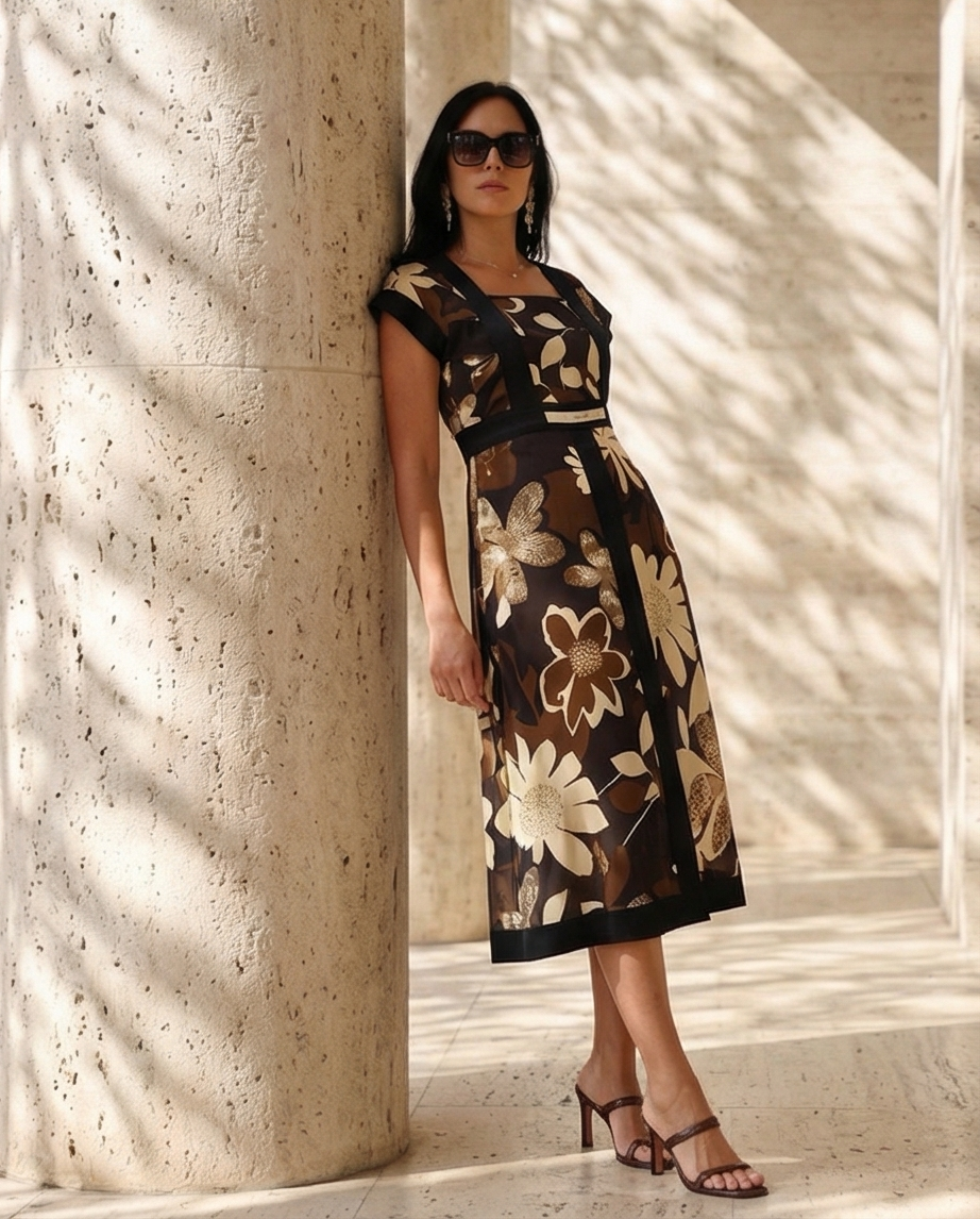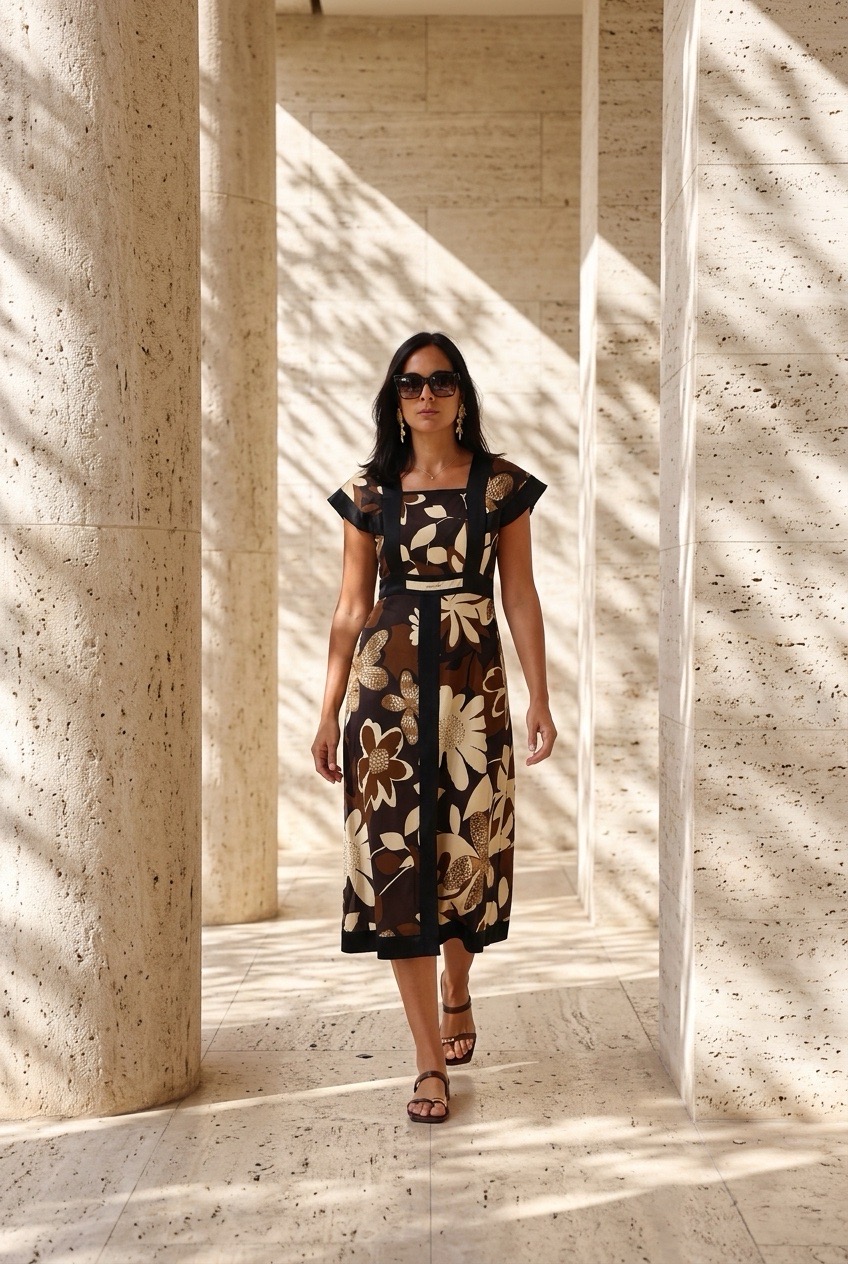 • Vestido midi feminino com padrão floral castanho, bege e preto, usado por mulher com óculos escuros