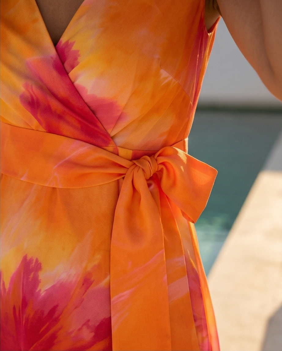 • Vestido laranja e rosa com laço na cintura junto a uma piscina
