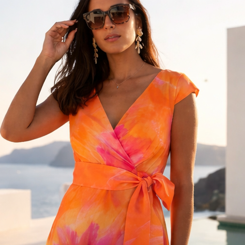 • Vestido de mulher laranja e rosa com cinto em laço e óculos de sol