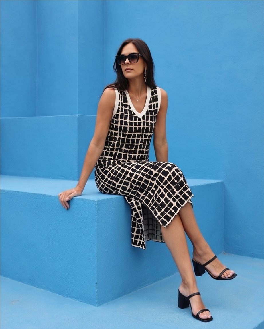 Este vestido midi de malha tem um estampado geométrico de quadrados em tons de Preto e Branco, com o decote em V realçado por um debrum branco contrastante. Inclui aberturas laterais na bainha para maior conforto e movimento.
