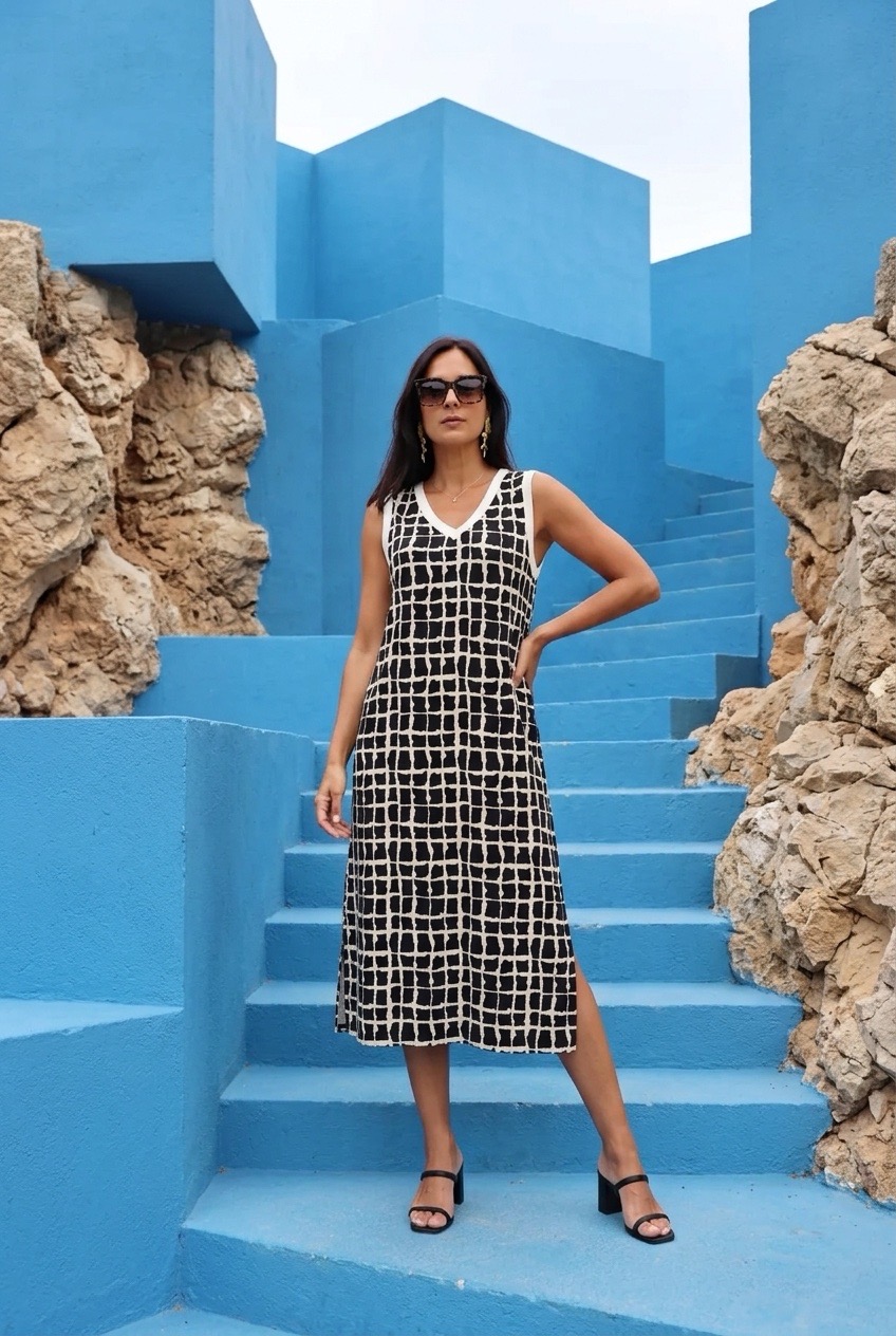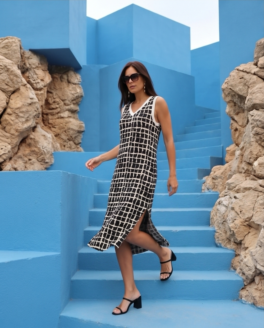 • Mulher a usar vestido midi preto e branco com padrão de grades a descer escadas azuis entre rochas