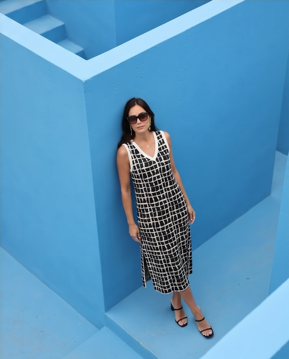 • Mulher usando vestido midi preto e branco com padrão xadrez, óculos de sol e sandálias pretas em ambiente com paredes azuis.