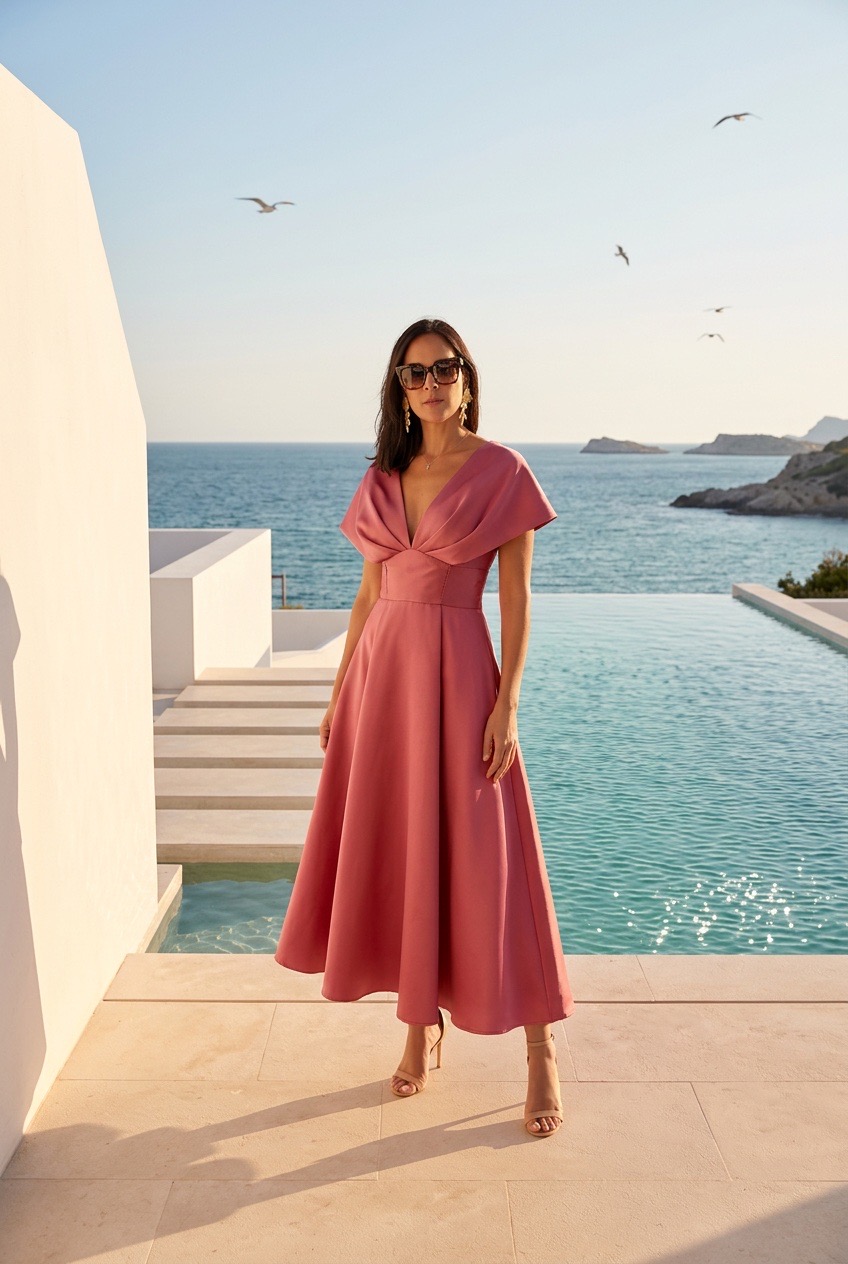 Mulher com vestido rosa midi e óculos escuros junto a piscina com vista para o mar.
