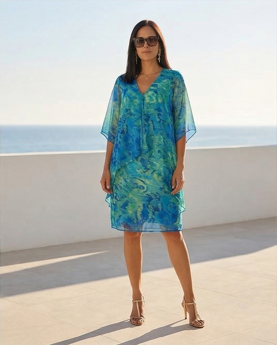 Mulher com vestido azul esvoaçante junto à piscina com vista para o mar Vestido Málaga 149,40 € Desconto de %. Partilhar Tamanho XL Comprar Contactar Este vestido tem um padrão abstrato em tons de azul e verde com um design em camadas, o tecido é leve e fluido que dá movimento. Cores que iluminam, cortes que alongam e detalhes que fazem a diferença.