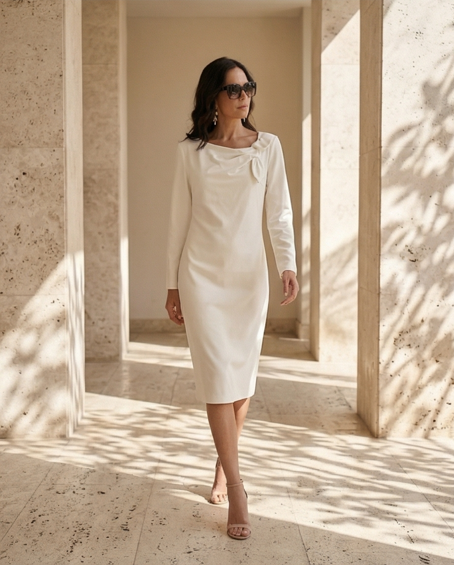 • Vestido branco elegante de manga comprida com detalhe de nó no ombro, tecido liso.