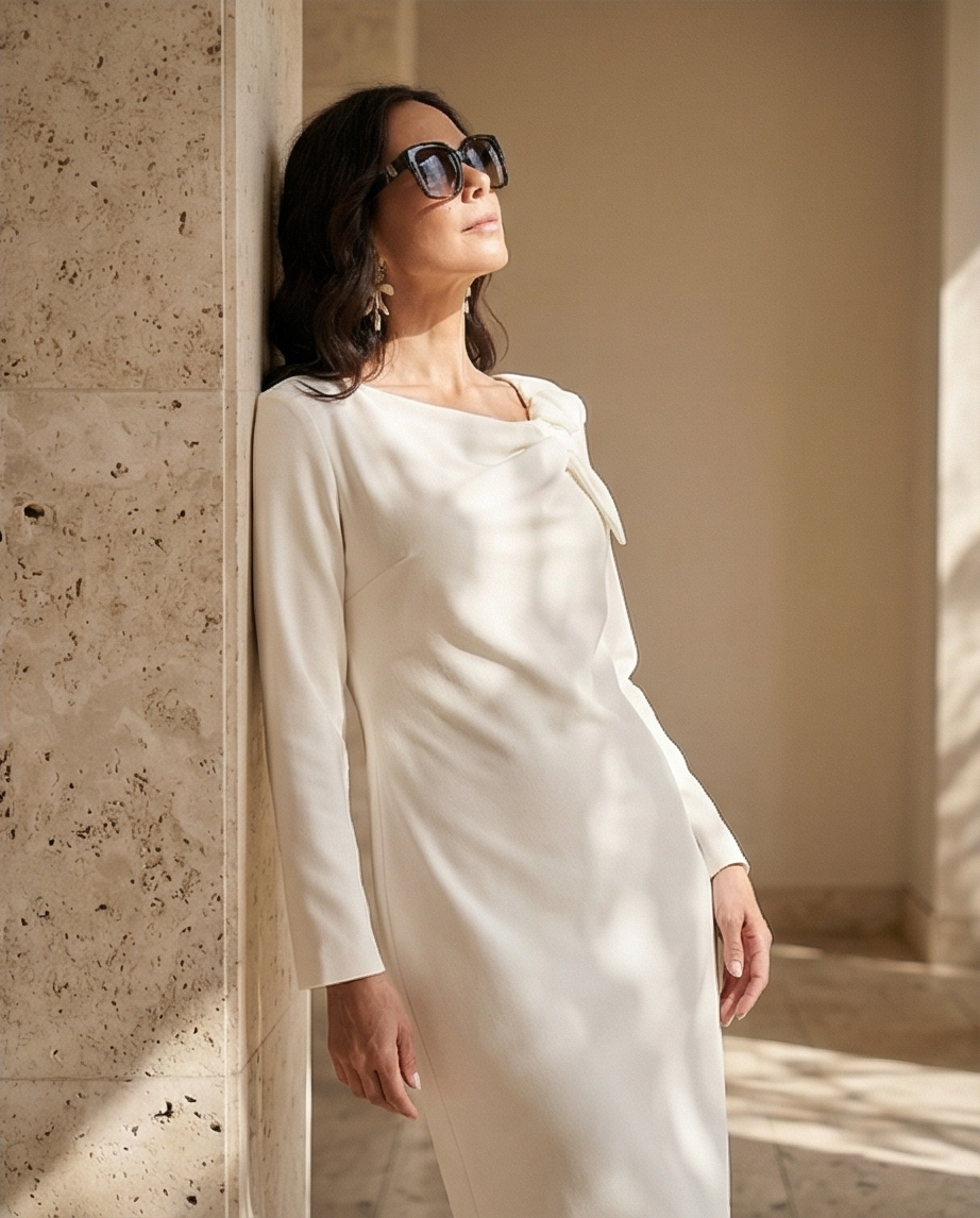 • Mulher com vestido branco de manga comprida e laço no decote, sandálias nude e óculos escuros em interior com parede e chão claros