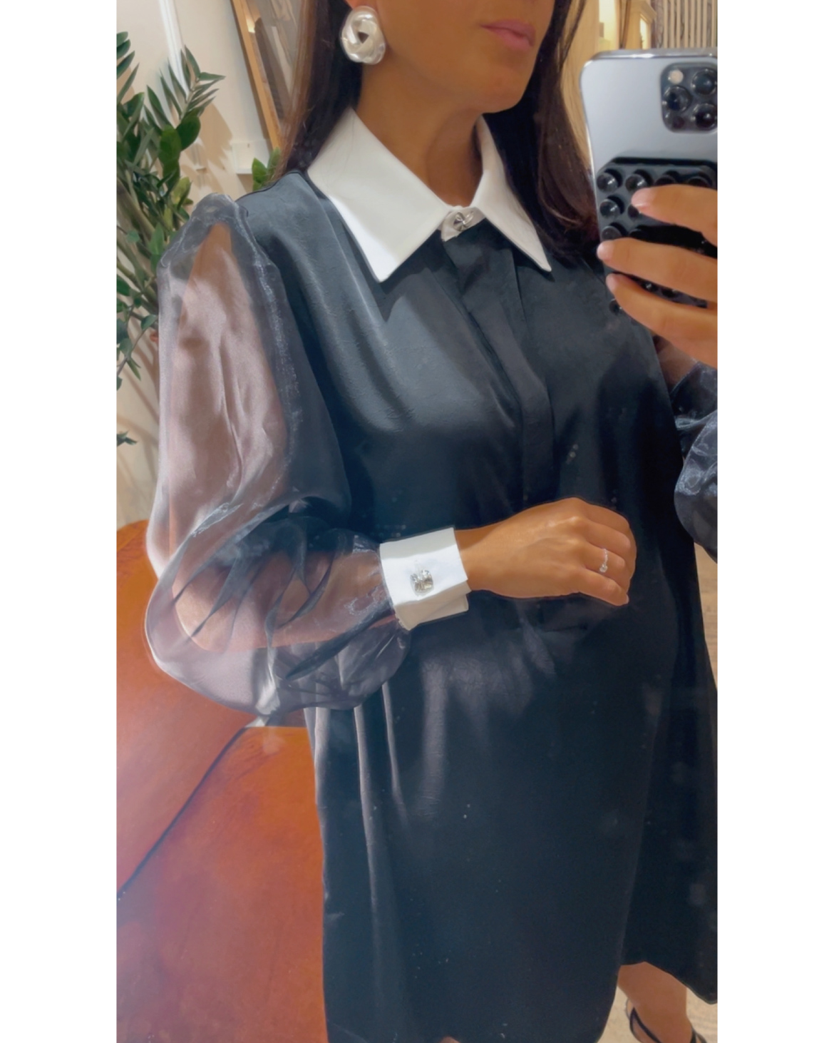 Vestido Reina 51,76 € 129,40 € Desconto de %. Partilhar Comprar Contactar Outlet FW26. Válido de 28 de Fevereiro de 2026 às 00:00 até 31 de Agosto de 2026 às 00:00. Vestido preto com gola e punhos brancos contrastantes, manga comprida transparente. Cor: Preto e Branco Tamanho - S