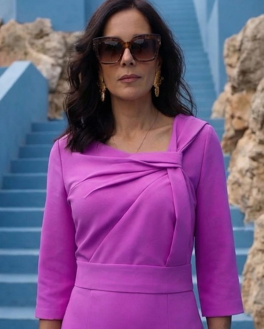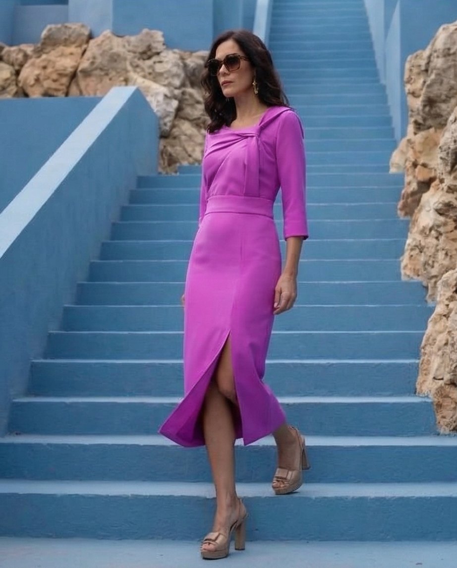 Mulher a desfilar vestido magenta numa escadaria azul com pedras naturais. Vestido Santiago 139,40 € Desconto de %. Partilhar Tamanho M/L L/XL Comprar Contactar Vestido linha a direito, decote subido assimetrico com nó, cinto no mesmo tecido, abertura racha na saia. Cor: rosa lilas