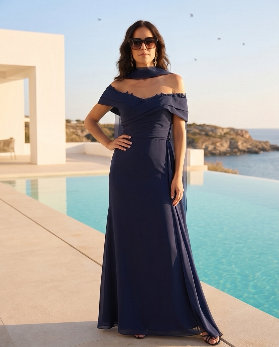 • Vestido longo azul escuro ombro a ombro com echarpe