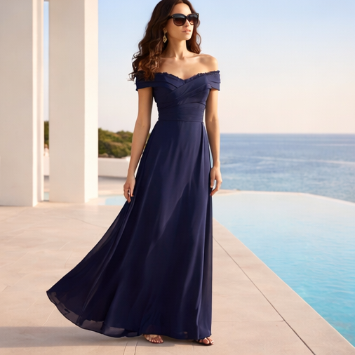 • Vestido longo azul escuro ombro a ombro perto de piscina e mar