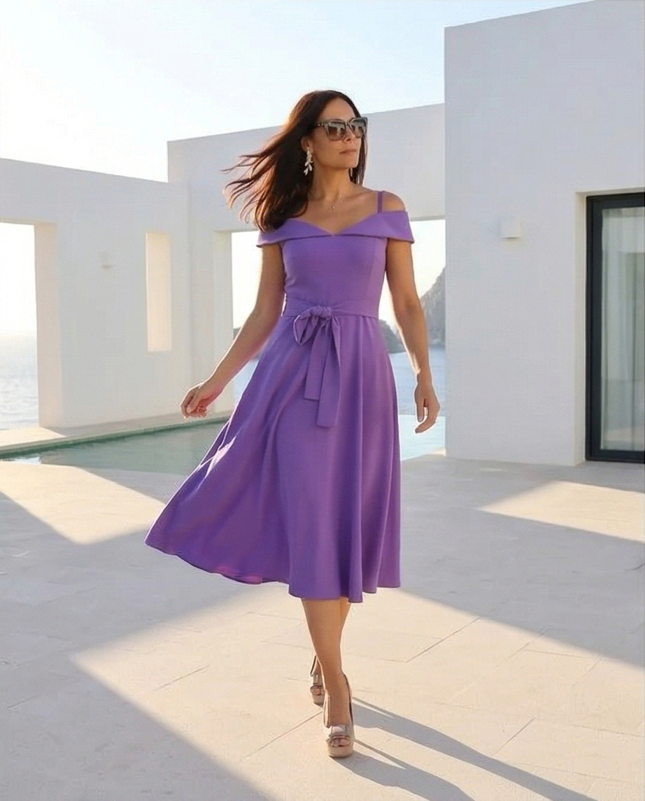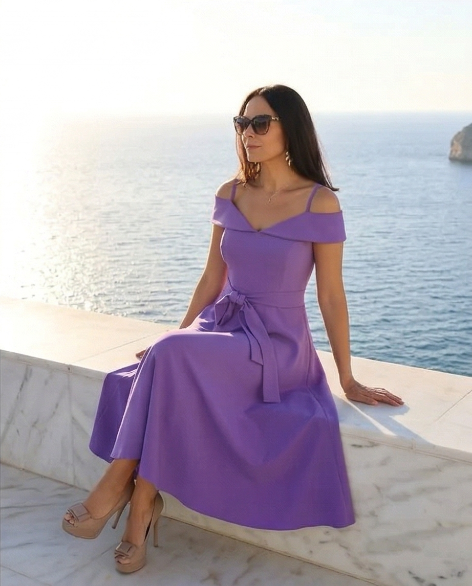 Mulher a usar vestido roxo junto a piscina e mar, mostrando detalhes do vestido. Vestido Sofia Violeta 119,40 € Desconto de %. Partilhar Tamanho S/M M/L Comprar Contactar Vestido midi, saia em evassé, decote descaido com gola princesa com alças finas, cinto em tecido. Cor: Violeta (tambem disponivel em azulão). 100%Polyester