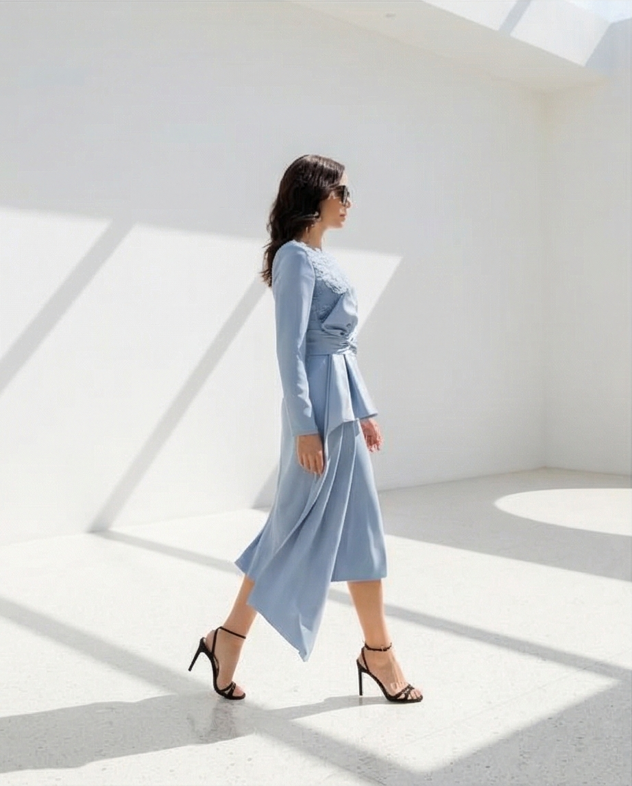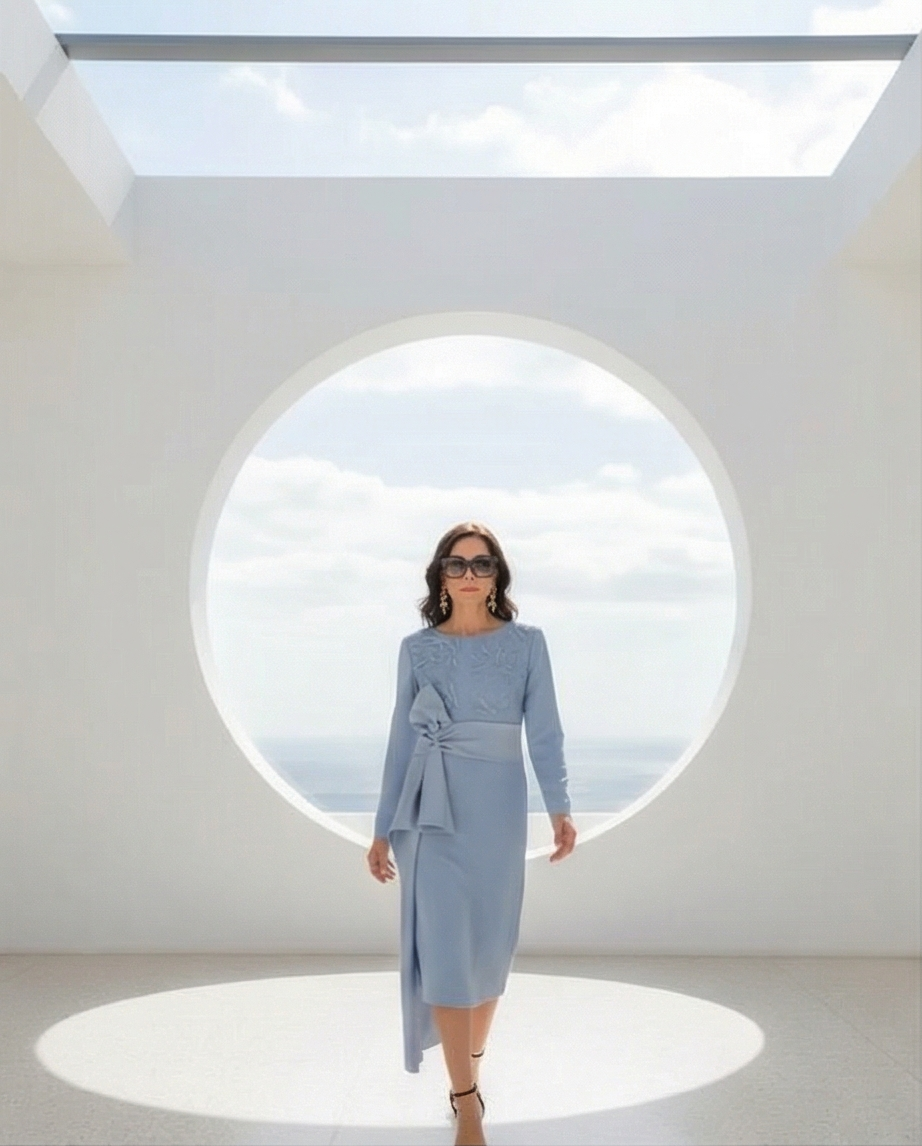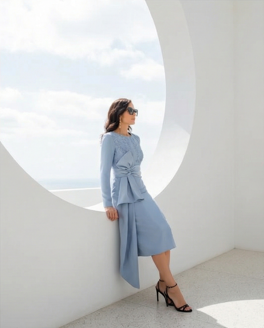 • Mulher a usar vestido midi azul claro com laço lateral, óculos escuros, num espaço branco com janela circular