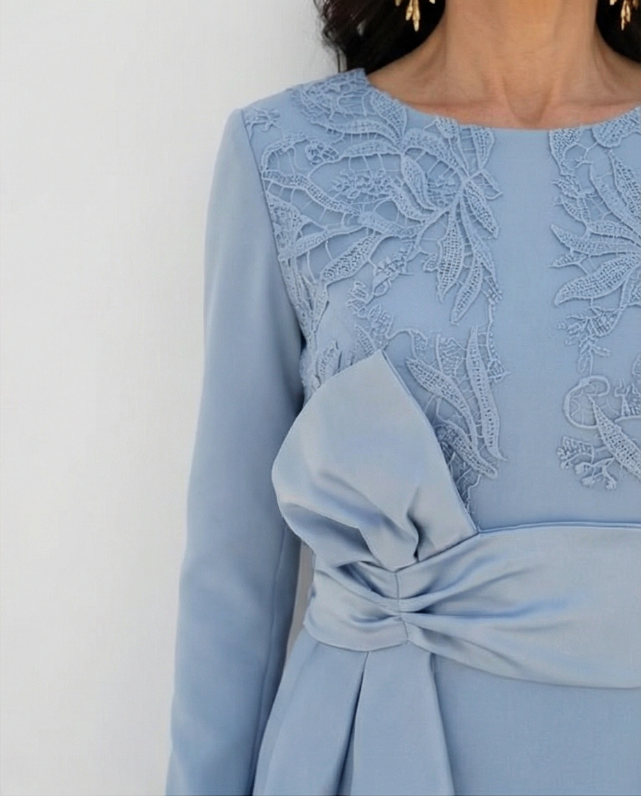 • Vestido azul claro com renda floral e laço na cintura